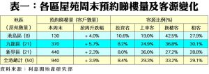 按地區劃分,港島、九龍及新界三區指標屋苑的周末預約睇樓量全線上升,其中以九龍區的升幅最大,該區21個指標屋苑於本周末暫錄370組客戶預約睇樓,按周升5.7%。利嘉閣地產匯景分行首席聯席董事萬達人表示,美國聯儲局昨日宣布利率維持不變,而本港有大型銀行隨後宣布不調整最優惠利率,息口走勢暫告平穩,憂慮加息的市民亦可鬆一口氣,徐徐外出物色心儀單位,藍田區本周末預約睇樓人數增加。至於業主方面,態度依然強硬,平均議價幅度僅在2%左右,相信準買家仍需時間適應樓價變化,短期內二手市況維持拉鋸。