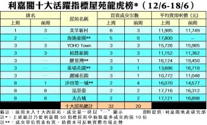 利嘉閣地產董事陳大偉表示,本港銀行就美國上周議息後保持最優惠利率不變,有助紓緩買家對加息的不安情緒;然而普遍業主持貨能力良好,二手單位叫價居高不下,十大屋苑交投量未見大幅反彈。綜合利嘉閣地產分行數據所得,全港十大活躍指標屋苑在上周(12/6–18/6)錄32宗買賣個案,較前周(5/6–11/6)的20宗增加60%,每個屋苑平均錄約3宗成交。