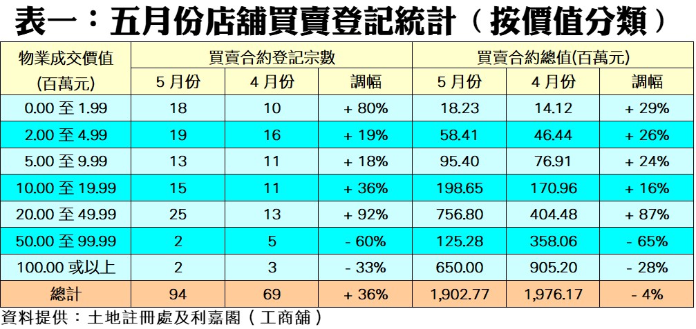 按物業價格劃分,在7個價格組別當中,共有5個組別的登記量報升,升幅介乎18%至92%不等。當中以2,000萬至5,000萬元以內組別的登記量升幅最凌厲,由四月的13宗大增至五月的25宗,並成為買賣登記最熱門的銀碼層。至於200萬元以下及1,000萬至2,000萬元以內兩個組別,亦分別大增80%及36%,至分別錄18宗及15宗登記。值得注意的是,5,000萬元以上的兩個高價組別雙雙錄得跌幅,各跌60%及33%,分別各有2宗登記,表現較其他組別遜色,反映高價店舖買賣暫作喘息(見表一)。