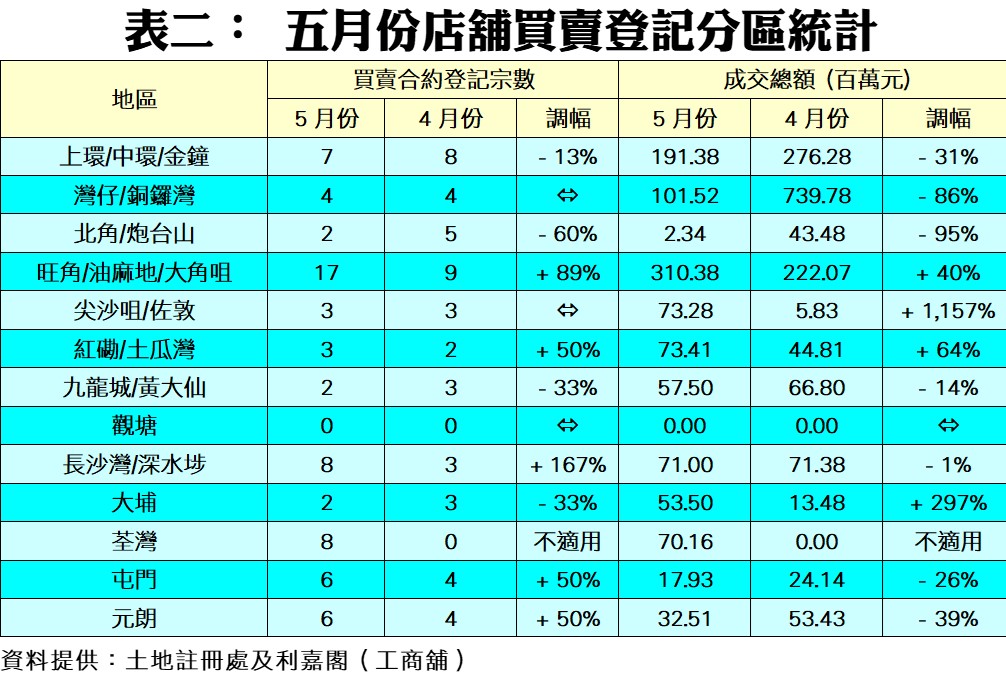 以地區劃分,在本行觀察的13個分區當中,共有6個地區的登記量按月上升,當中以長沙灣/深水埗區的1.67倍升幅最顯著,由四月的3宗激增至五月的8宗;旺角/油麻地/大角咀區亦錄89%的升幅,月內有多達17宗登記,並成為最活躍的觀察區。至於紅磡/土瓜灣、屯門及元朗三個觀察區於月內均錄得50%的升幅,連同荃灣區亦由前月的「零登記」,一躍至五月有8宗買賣,反映民生消費區店舖再受追捧。至於一些傳統核心旅遊區上月登記量則或跌或持平,當中上環/中環/金鐘區逆市微跌1宗,至只有7宗登記;而灣仔/銅鑼灣及尖沙咀/佐敦區則按月持平,分別只有4宗及3宗。