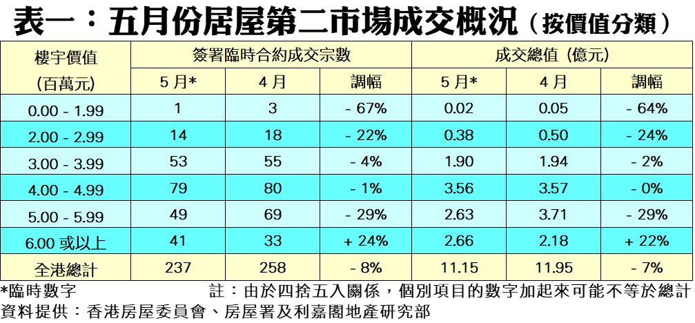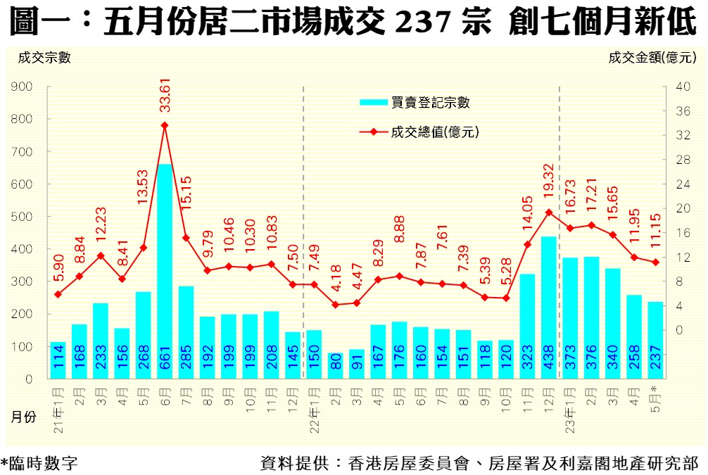 利嘉閣地產研究部主管陳海潮表示,本港於年初全面恢復通關,樓市交投轉趨活躍,樓價順勢反彈;此時發展商把握機會積極推盤,吸引大批買家查詢認購,二手客源逐漸被市場瓜分。另外,房委會擬於年中開始接受「居屋2023」申請,不少居屋客或等候新居屋抽籤後再作打算,令居屋第二市場交投持續受壓。據香港房屋委員會及房屋署網頁最新數據,五月份全港錄237宗居屋第二市場買賣個案(按簽署臨時買賣合約的成交為準),較四月份的258宗按月下跌8%,連續三個月錄得跌幅,為近七個月新低;至於五月份未補價物業成交總值約11.15億元,較四月份的11.95億元同步減少約7%。
