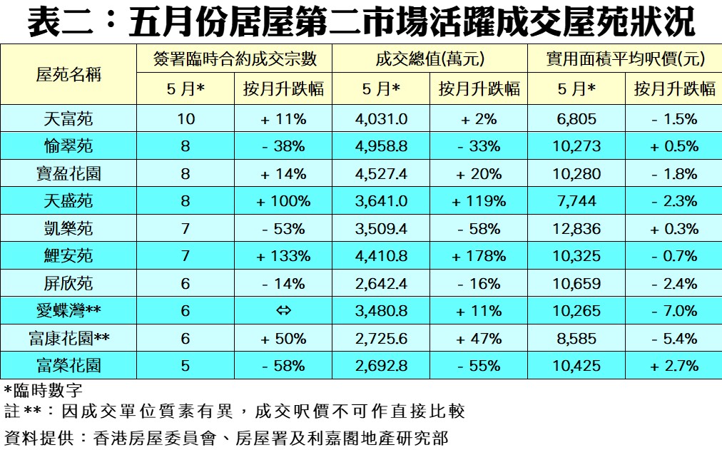 按物業價值劃分(見表一),五月份共有5個組別交投量按月下跌,撇除200萬元以下組別基數較低不計,其中價值500至600萬元以內組別交投跌幅最為明顯,由四月份的69宗買賣,跌至上月僅49宗,按月大減29%或20宗;最活躍的交投組別則為價值400至500萬元以內的居二單位,五月份共錄得79宗成交,按月僅微跌1%或1宗。若按屋苑劃分(見表二),五月份旺角富榮花園錄5宗成交,按月急挫58%,成交總值亦同步減少55%至2,692.8萬元;至於天水圍天富苑則以10宗買賣成為上月居屋第二市場交投最活躍的屋苑,成交總值涉資約4,031.0萬元。