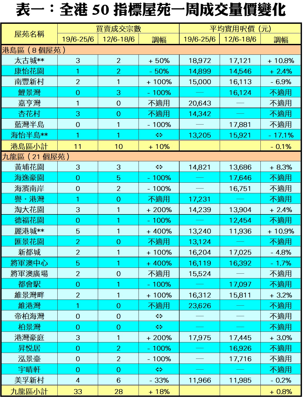 至於,港島區8個指標屋苑上周共錄11宗成交,較前周的10宗增加1宗或10%,當中南豐新村錄得2宗交投,較前周的1宗增加1倍;藍籌屋苑太古城期內錄得3宗買賣,成交量按周增加50%;不過,鯉景灣及藍灣半島期內暫未錄得交投,雙雙「捧蛋」。此外,在全港50個指標屋苑當中,上周共有19個屋苑錄得「零成交」,較前周的14個增加36%,當中九龍區及新界區各佔9個及8個屋苑,港島區則佔2個(詳見表一)。