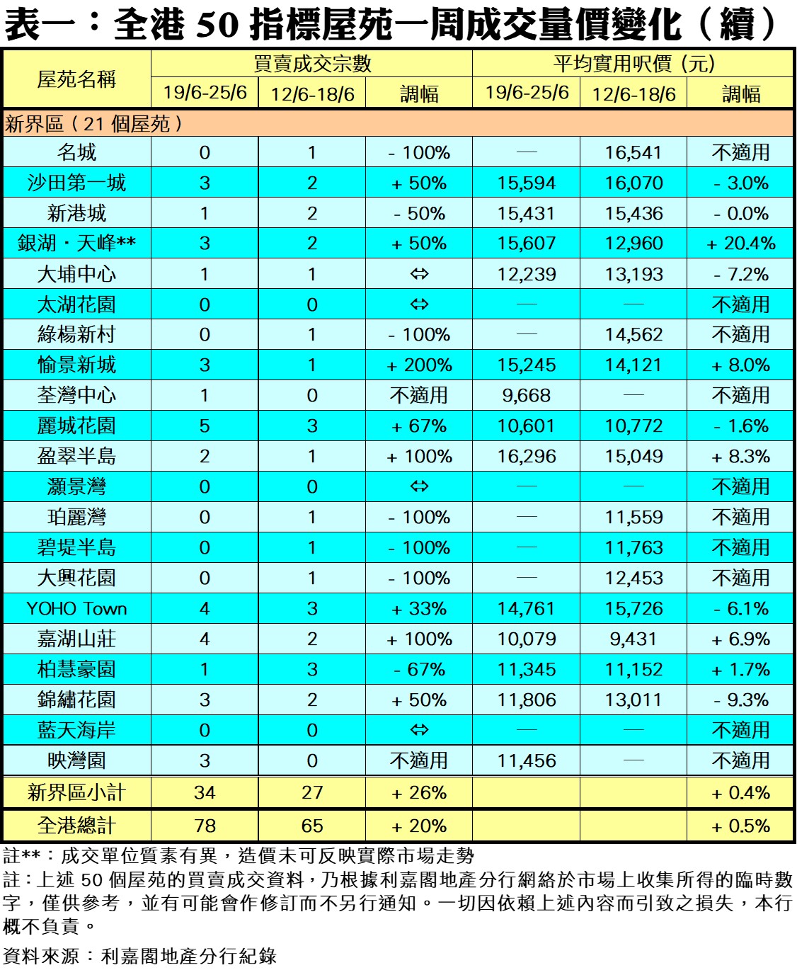 利嘉閣地產董事陳大偉表示,對上一周市場上未有全新大型一手樓盤開售,部分向隅客回流到二手市場尋寶;而且買家逐漸適應樓價變化,其中有實際需求的客人按捺不住入市,帶動二手屋苑成交量略為增加。綜合利嘉閣地產分行數據所得,全港50個指標屋苑於上周(19/6—25/6)共錄78宗買賣個案,較前周(12/6—18/6)的65宗增加20%,創近八周新高,惟仍處於八十宗以下水平窄幅上落。