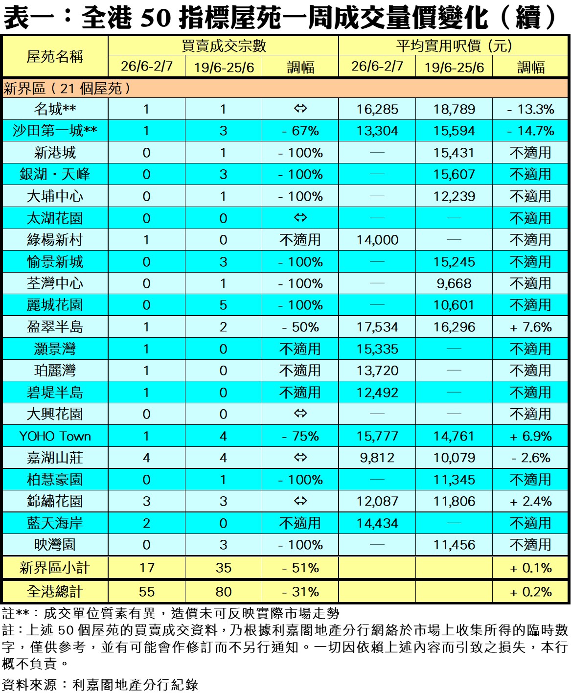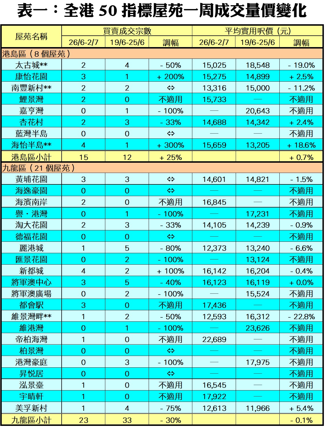 至於,港島區8個指標屋苑上周共錄15宗成交,較前周的12宗增加25%,當中海怡半島錄得4宗交投,較前周的1宗增加3倍;康怡花園錄得3宗買賣,成交量按周增加2倍;嘉亨灣藍灣半島期內暫未錄得交投,雙雙「捧蛋」。此外,在全港50個指標屋苑當中,上周共有21個屋苑錄得「零成交」,較前周的18個增加17%,當中九龍區及新界區各佔9個及10個屋苑,港島區則佔2個(詳見表一)。
