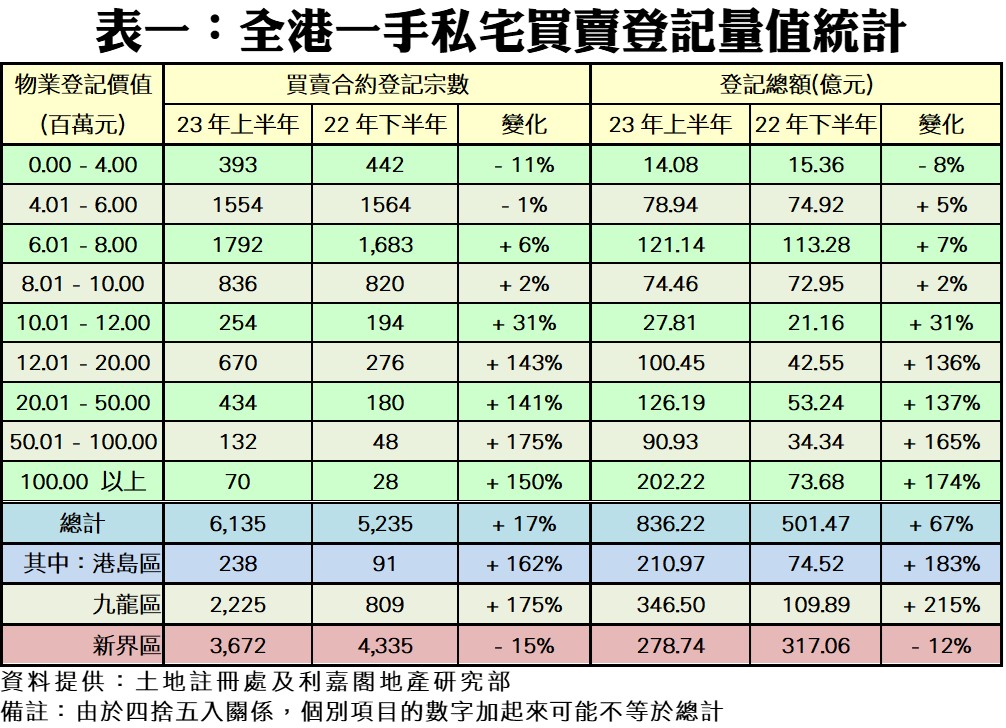 利嘉閣地產研究部主管陳海潮表示,通關復常帶動,上半年一手新盤銷情持續回升,料下半年受惠中高價物業按揭放寬及經濟持續復甦,內部及外來需求齊撐下,新盤買賣升勢將延續。綜合土地註冊處最新數據所得,今年上半年全港累錄6,135宗一手私宅買賣登記,較去年下半年的5,235宗上升17%,而與去年同期比較更增30%,實現兩連升,並創近3個「半年度」新高。至於期內物業登記總值同創3個「半年度」最多,錄約836.22億元,較去年下半年的501.47億元急增67%。上半年平均每宗一手私宅售價約1,363.03萬元,較去年下半年細價盤當道的957.92萬元均價大增42.3%。