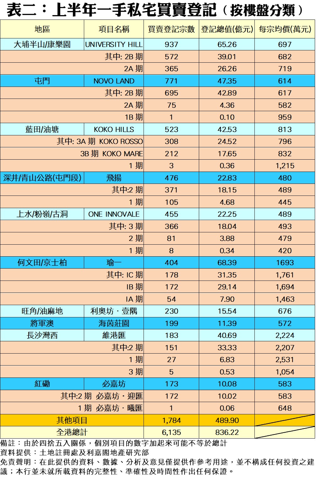按樓盤分類,在過去半年累錄買賣登記宗數最多的新盤是屯門NOVO LAND 2B期的695伙;其次是大埔UNIVERSITY HILL 2B期的572伙登記,而第三及第四位分別是位處屯門的飛揚2期及粉嶺的ONE INNOVALE 3期,分別錄371宗及366宗。