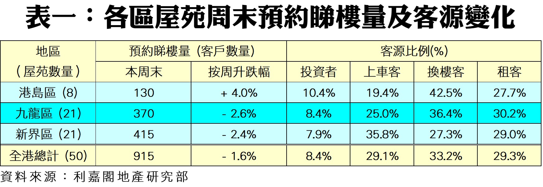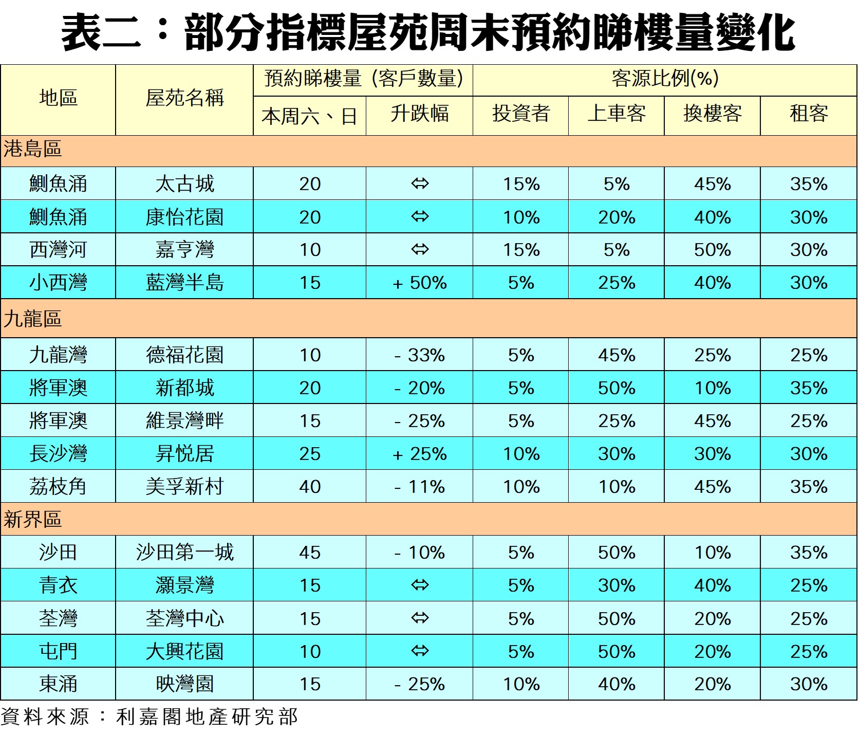 利嘉閣地產研究部主管陳海潮表示,政府上周宣布放寬按揭成數上限,主力幫助換樓市場,然而息口趨升風險尚未解除,加上各區多個一手新盤搶推,吸走市場客源及購買力,本周末二手指標屋苑預約睇樓量走勢偏軟。根據利嘉閣地產研究部數據估算,全港50個指標屋苑共錄915組客戶於周末預約睇樓,按周下跌1.6%,為近五周新低水平。