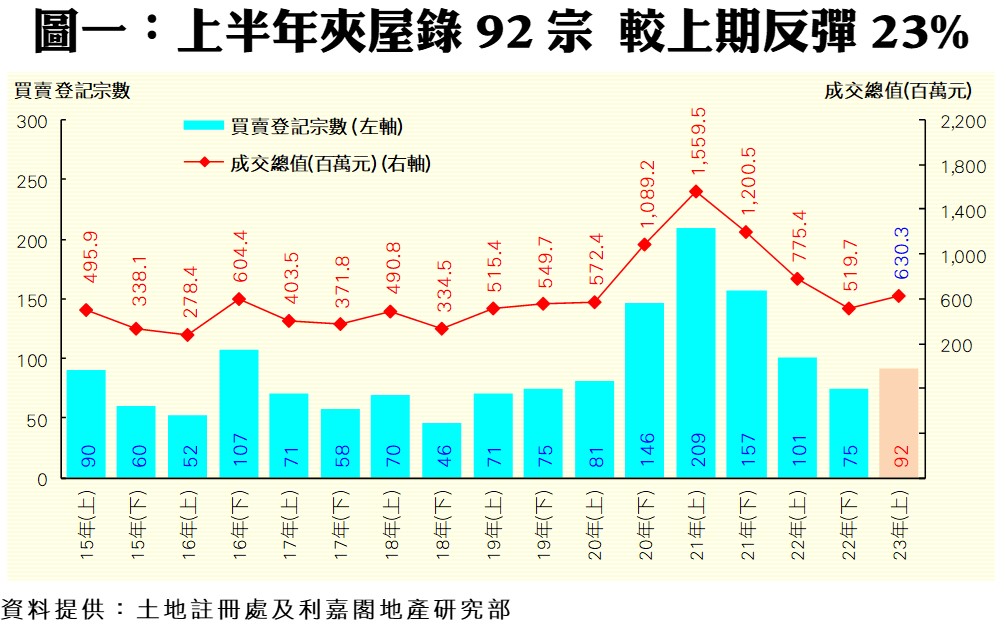 利嘉閣地產研究部主管陳海潮表示,第五波新冠疫情於去年大舉肆虐,本地樓市備受牽連,夾屋買賣登記量更一度跌至近年新低水平;不過,港府年初先後恢復通關及撤銷防疫政策,疫情變相悄然落幕,刺激本港經濟穩步復常,市民入市信心增加,夾屋交投乘勢反彈。根據土地註冊處最新資料顯示,今年上半年夾屋買賣錄92宗登記,較去年下半年的75宗增加23%,終止三連跌,惟登記量仍為近三年次低;至於期內成交總值錄6.30億元,較上期的5.20億元同步上升21%。