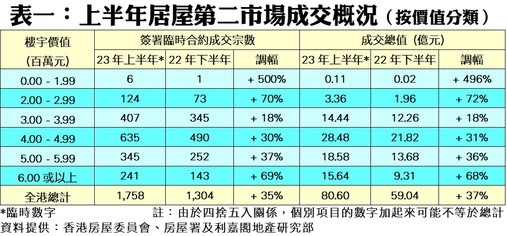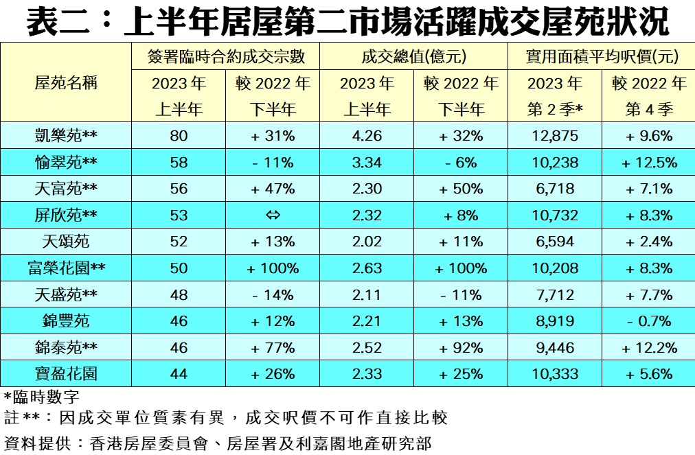 按物業價值劃分(見表一),上半年6個組別交投量全線上升,撇除200萬元以下組別基數較低不計,其中價值200至300萬元以內組別交投升幅最為顯著,由去年下半年的73宗買賣激增七成至今年上半年的124宗;至於最活躍的交投組別則為價值400至500萬元以內的居二單位,上半年共錄得635宗成交,較上一個半年度的490宗增加30%。若按屋苑劃分(見表二),上半年旺角富榮花園錄50宗成交,按半年急增1倍,成交總值亦同步翻倍至2.63億元;至於長沙灣凱樂苑則以80宗買賣成為2023上半年居屋第二市場交投最活躍的屋苑,成交總值涉資約4.26億元。