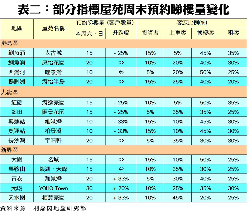 利嘉閣地產研究部主管陳海潮表示,下周適逢美國聯儲局議息,議息結果將對本港銀行利率走勢起指標性作用,市民屏息等候結果出爐後再作打算,令港府日前放寬按揭對樓市的提振作用受限,本周末二手指標屋苑預約睇樓量持續回落。根據利嘉閣地產研究部數據估算,全港50個指標屋苑共錄905組客戶於周末預約睇樓,按周下跌1.1%,連跌4周。