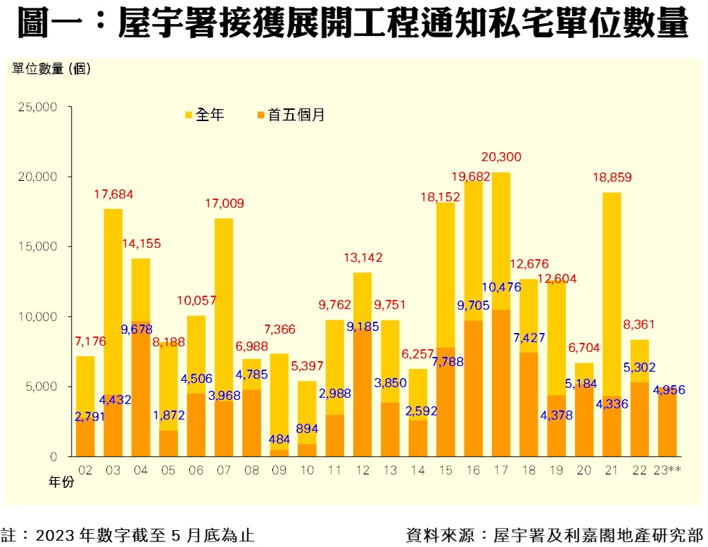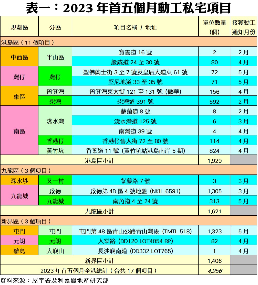 連同上述項目,2023年首五個月全港共17個私宅項目動工,涉及單位總數4,956伙。當中以港島區的施工單位數量最多,涉及11個項目合共1,929伙,單位佔整體比例達38.9%;九龍區則有3個私宅項目動工,單位數量1,621伙,佔整體比率近32.7%;而新界區期內也有3個私宅項目動工,單位數量1,406伙,佔整體比率近28.4%。