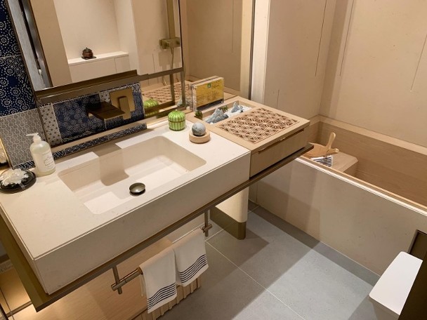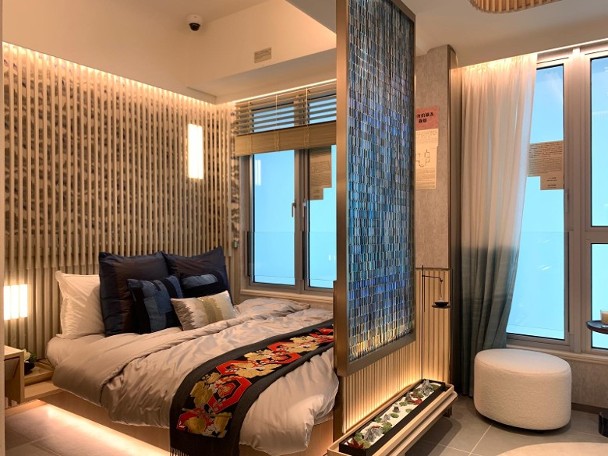 經改動裝修示範單位參照2A座20樓C室搭建,實用面積447方呎,採兩房間隔設計。甫入單位即見開放式廚房設於大門左側,爐具家電設備齊全,長方形開則的客飯廳連接開放式廚房,採用和式風格設計,兩間睡房與客廳同向,其中主人房拆除間隔牆增加空間感,有足夠位置擺放大床,並預留空間放置衣櫃;另一間睡房則改建成為書房,方便戶主工作,而浴室則毗鄰睡房,裏面放置日式浴缸,盡現和風。
