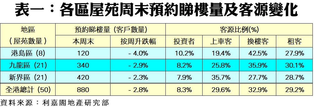 按地區劃分,港島、九龍及新界三區指標屋苑的周末預約睇樓量全線下跌,其中以港島區的跌幅最大,該區8個指標屋苑於本周末暫錄120組客戶預約睇樓,按周跌4.0%。利嘉閣地產逸樺園分行聯席董事吳玉蘭表示,雖然本港主要銀行上調最優惠利率,不過買賣雙方對加息習以為常,未有太大的即時反應,康怡花園及南豐新村周末預約睇樓量維持平穩,本月分別暫錄約6宗及1宗成交。吳玉蘭指出,近日部分新盤低開吸客,價格具競爭力,準買家期待二手樓價亦能提供較大折讓,惟二手放盤普遍雖有議價空間,但罕有大幅減價,雙方期望有一定落差,準買家入市態度較為觀望;另一方面,康怡及鰂魚涌區本月錄約78宗租賃交投,暑期租務旺勢持續。