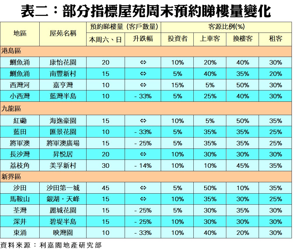 利嘉閣地產研究部主管陳海潮表示,發展商以低市價推出新盤,旋即成為全場焦點,同時凍結了二手屋苑睇樓及交投,本周末二手指標屋苑預約睇樓量再度偏軟。根據利嘉閣地產研究部數據估算,全港50個指標屋苑共錄850組客戶於周末預約睇樓,按周下跌3.4%,連續兩周處於900組以下水平。