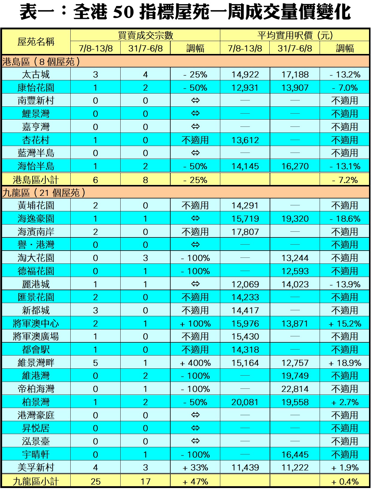 至於,港島區8個指標屋苑上周共錄6宗交投,較前周的8宗減少2宗或25%,當中康怡花園及海怡半島各錄1宗買賣,分別按周減少50%;藍籌屋苑太古城交投量則由前周的4宗,減少25%至上周的3宗;至於南豐新村、鯉景灣、嘉亨灣及藍灣半島上周均暫未聞交投。此外,在全港50個指標屋苑當中,上周共有23個屋苑錄得「零成交」,較前周的20個增加15%,當中港島區及九龍區分別佔4個及9個屋苑,新界區則佔10個(詳見表一)。
