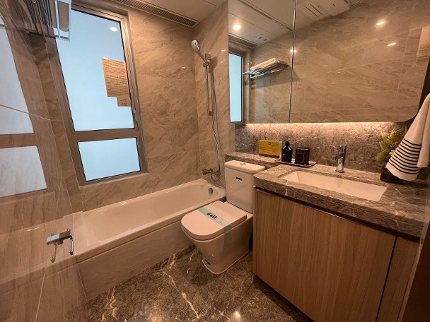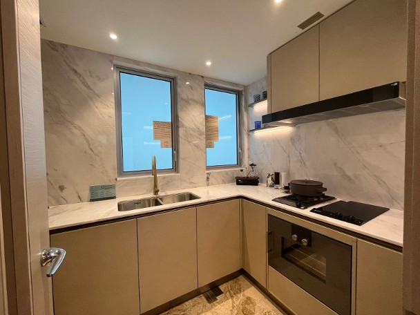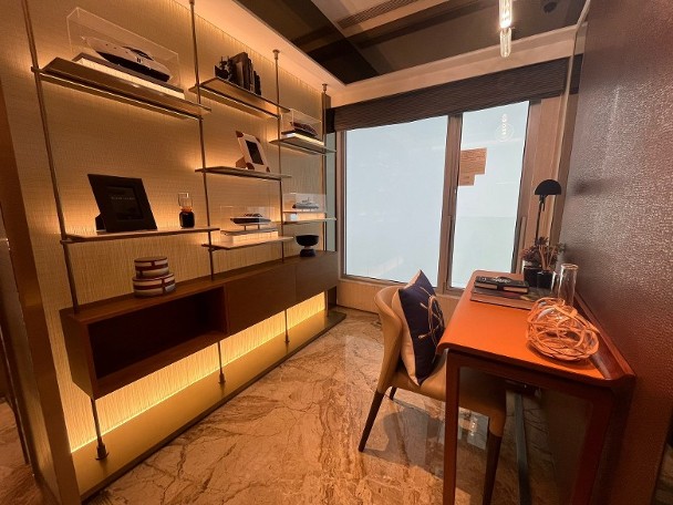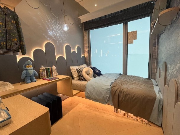 客飯廳之間設走廊貫穿睡房區。設計師將靠近客廳的睡房佈置成書房,拆除部份牆身,並擺放書枱及陳列層架。另一間則布置成兒童睡房。至於主人套房就預留有衣櫃位,並連接主人浴室,屬「明廁」設計。廚房的家電齊備,另設有通風窗。