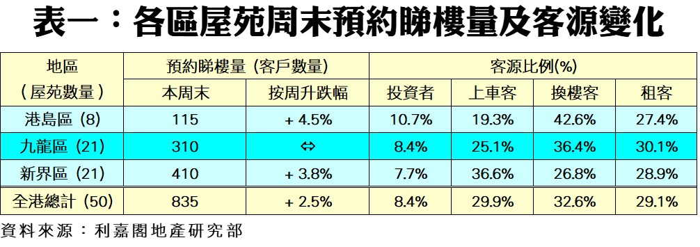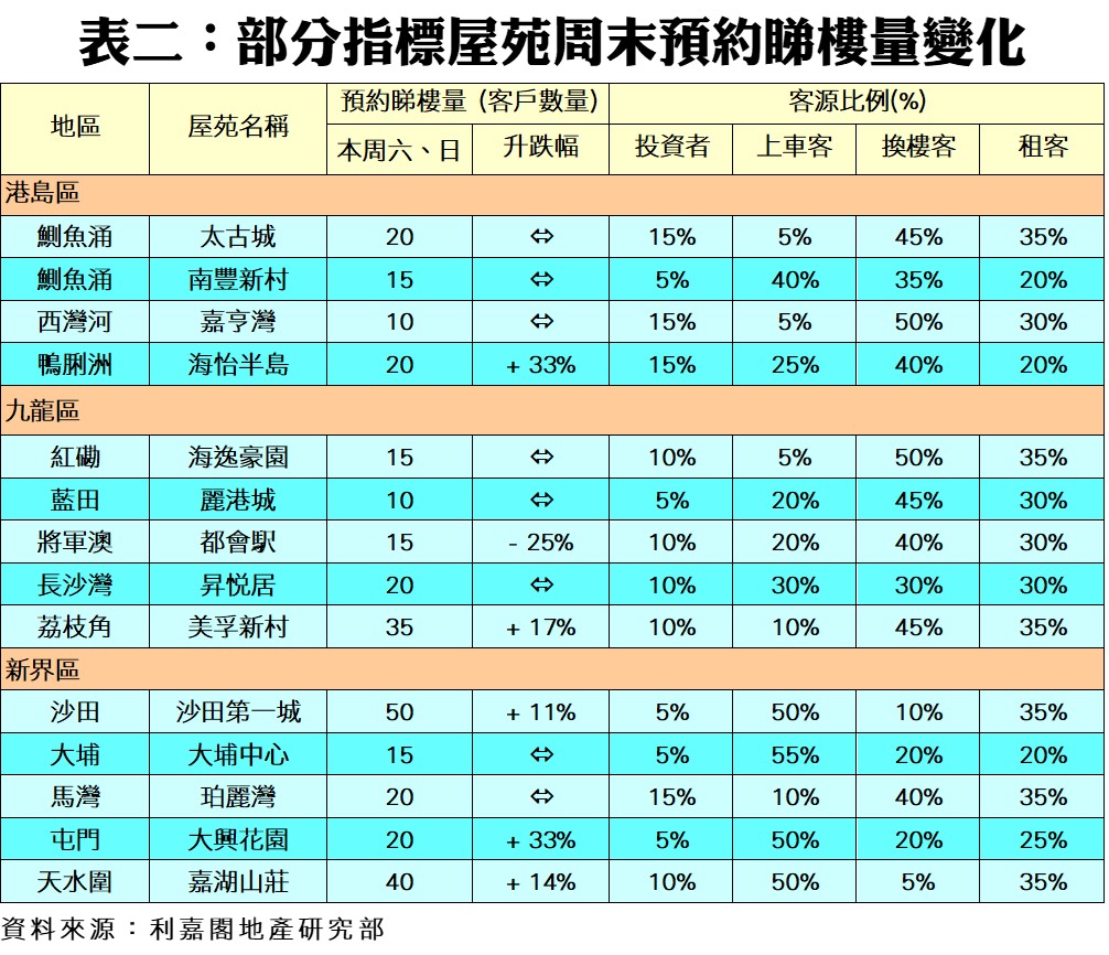 利嘉閣地產研究部主管陳海潮表示,低價新盤反應熱烈,同時為市場積累了一批向隅客,在新一輪開賣之前選擇回流二手市場尋寶,本周末二手指標屋苑預約睇樓量止跌回升。根據利嘉閣地產研究部數據估算,全港50個指標屋苑共錄835組客戶於周末預約睇樓,按周上升2.5%,終止七連跌。