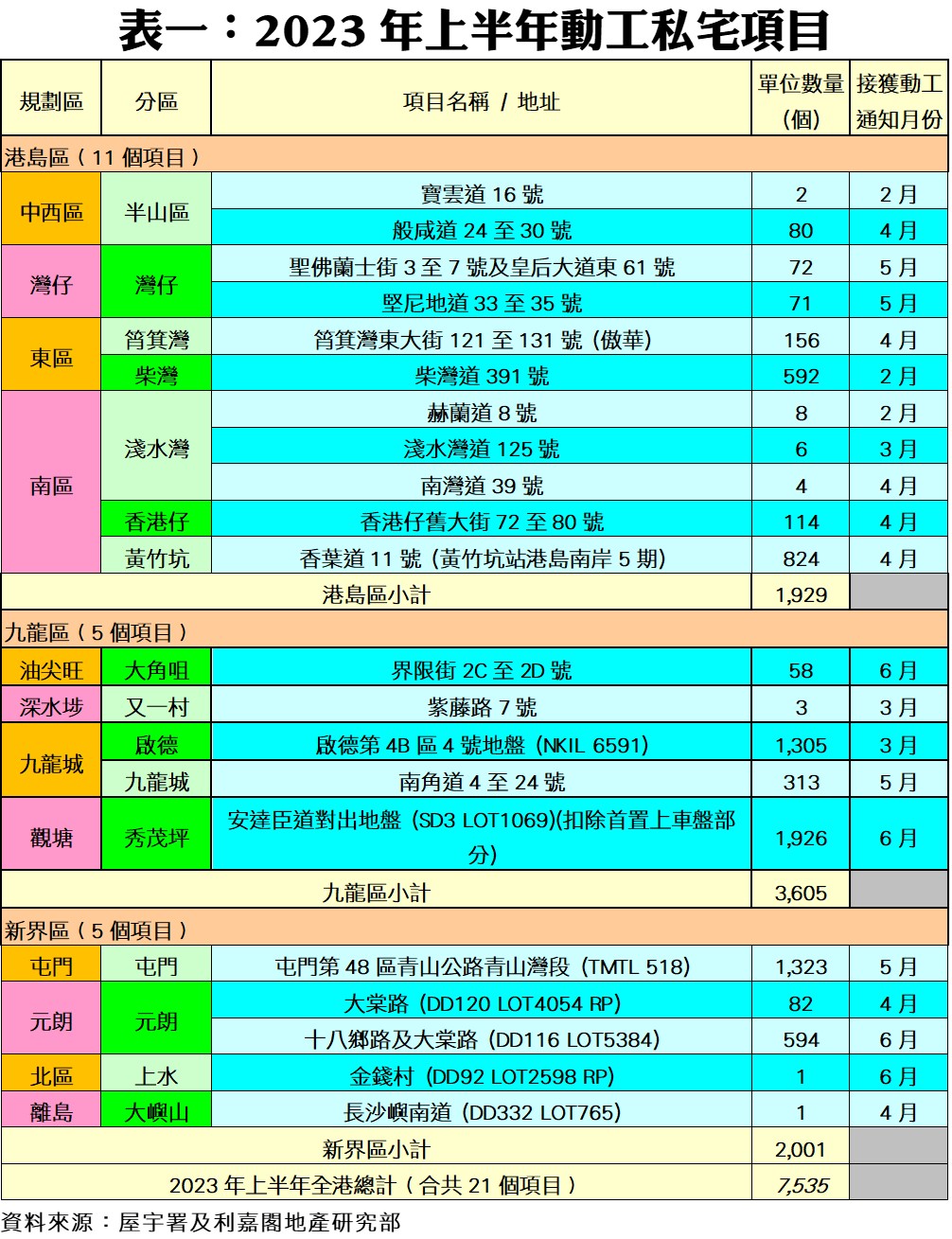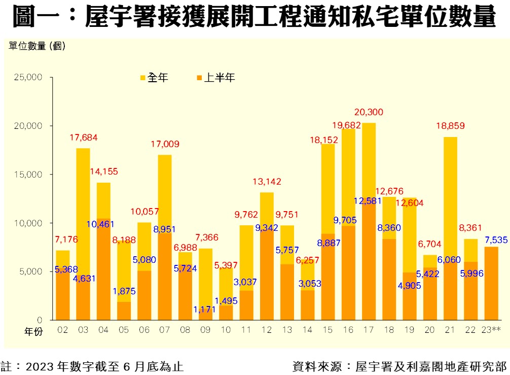 連同上述項目,2023年上半年全港共有21個私宅項目動工,涉及單位總數7,535伙。當中以九龍區的施工單位數量最多,涉及5個項目合共3,605伙,單位佔整體比例達47.8%;新界區亦有5個私宅項目動工,單位數量2,001伙,佔整體比率近26.6%;而港島區期內多達11個私宅項目動工,單位數量1,929伙,佔整體比率25.6%。