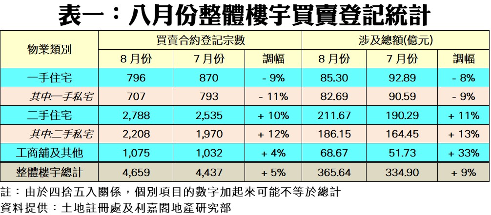 利嘉閣地產研究部主管陳海潮指出,近月一二手住宅買賣持續偏軟,業主接受現實減價後,登記量終在低位覓得支持。根據土地註冊處數據所得,2023年八月份全港共錄4,659宗樓宇買賣登記(數字主要反映七月中旬至八月上旬的樓市實際狀況),較七月份的4,437宗回升5%,為連跌四個月後首見回穩,惟仍處於不足五千宗的低水平窄幅徘徊;而月內整體物業登記總值按月也升9%,錄得365.64億元,同樣終止四連跌。