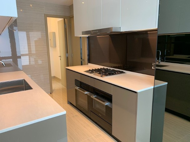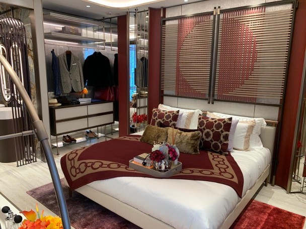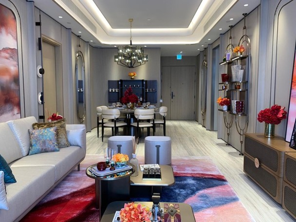 其中一對示範單位參照2座15樓E室搭建,連改動裝修示範單位採用三房連套房及工作間連廁設計,實用面積1,023方呎,整個單位以香檳金作為主調,客飯廳擺放餐枱後仍有充足活動空間,設計師亦將其中一間睡房的牆身打通,擴大空間放置衣帽間及書枱,令主人房空間更寬敞;而同則無改動示範單位間隔呎數相同,大門位置設有玄關,客飯廳涇渭分明。