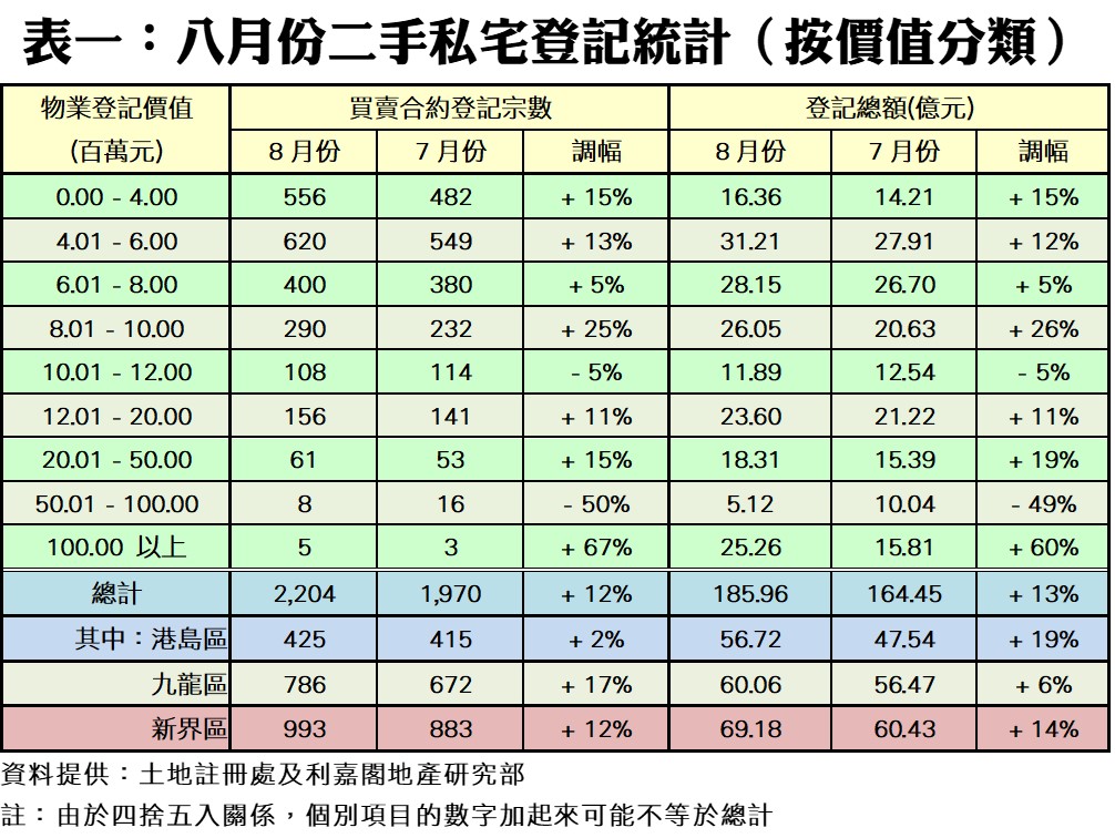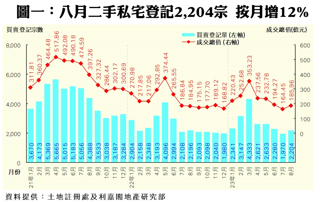 利嘉閣地產研究部主管陳海潮表示,原料「價跌量升」的二手市場,一踏入九月份即遭受風吹雨打,加上銀行突如其來大加按息,二手買賣登記恐難以招架而調頭再跌。根據土地註冊處數據所得,2023年八月份全港共錄2,204宗二手私宅買賣登記(數字主要反映七月中旬至八月上旬期間的市場實況),較七月份的1,970宗回升12%,為連跌兩個月後反彈並重越二千宗之上,惟仍處年內次低水平。至於,八月份登記總值按月同步增加13%,錄得185.96億元,是連挫四個月後首次回升;而平均每宗登記涉資843.72萬元,按月微升1.1%,維持窄幅上落。