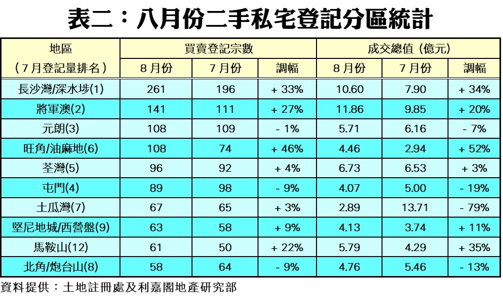 按全港三區作分析,八月份港九新界三區登記量全線上升。當中,九龍區登記量按月升17%,跑贏大市,月內錄得786宗登記;新界區則按月升12%,共錄993宗登記;至於港島區只微升2%,錄425宗登記。另外,十大最活躍成交分區的登記量亦升多跌少,當中以旺角/油麻地區的升幅最顯著,月內錄得108宗登記,按月大升46%。至於長沙灣/深水埗及馬鞍山兩區分別錄得33%及22%的增幅,前者錄得261宗,並成為登記量最多的分區,後者則有61宗。