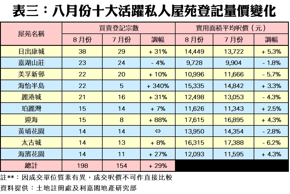 此外,上月十大活躍二手私人屋苑登記量中,錄得八升、一跌及一持平,其中以海怡半島升幅最勁,月內錄得22宗登記,按月激增3.4倍;其次的迎海則有15宗登記,按月大升88%。此外,上月日出康城仍為登記量最活躍的屋苑,共錄38宗,且按月升31%。至於嘉湖山莊斯人獨憔悴,按月減少4%至只有23宗登記,而黃埔花園則持平在14宗無升跌。此外,上月十大活躍屋苑總計登記量達198宗,較七月的154宗升近三成。