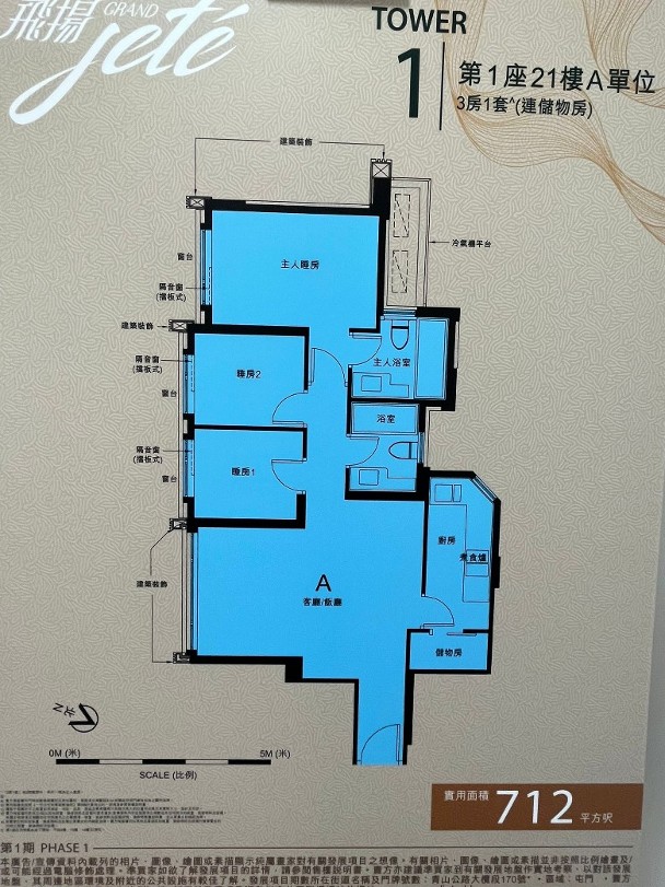 長實集團(01113)及新鴻基地產(00016)發展的飛揚第1期,周三(20日)首度開放現樓單位予傳媒參觀,為1座21樓A室,實用面積712方呎,屬三房連儲物室間隔。