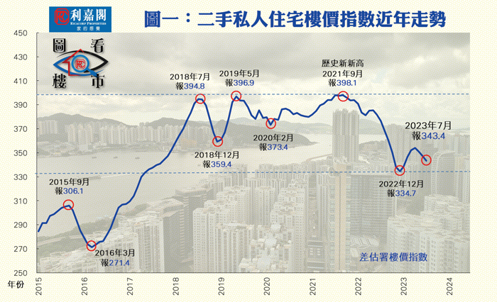 樓市自從2015年第四季至2016年首季經歷完當時的環球股市淡況後,已迅即反彈,而且一直大升至2018年年中的中美貿易戰爆發才回落,緊接是2019年的社會運動及2020年起至2023年初的新冠疫情;雖然面對連續三項世紀一遇的重大利淡挑戰,惟此段期間樓價非但沒有急跌,更再先後兩度創下歷史高峰,一次為2019年5月的396.9點,另一次則為2021年9月的398.1點(見圖一),而期間,樓價的最高上下波幅亦只有10.8%。要數近年樓價最大的跌幅,集中在2022年,若從2021年9月的歷史高位計起,跌至2022年12月334.7點的低位,累積跌幅達15.9%;而此浪最急跌勢主要集中在下半年,因為當時息口開始上升,香港也告別長期低息年代,致令樓價顯著下跌。