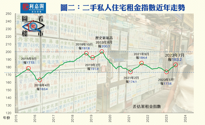 上述部分獲批專才年內起已魚貫來港,加上暑期內來港的留學生大量進駐,已率先起動了本地的租務需求,帶動近月租賃量價齊升。自從年初通關復常後,差估署租金指數自2月起即展現升勢,且連漲6個月,重越183點之上的水平(見圖二),而至今年7月時更創了自2021年11月以來的21個月新高,反映整個上半年租金均呈強勢,累積升幅高達5.5%。