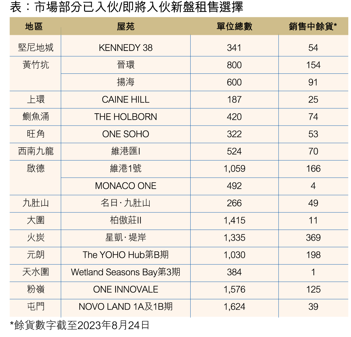 目前市場不乏一些餘貨新盤,包括如:火炭星凱·堤岸、大圍柏傲莊I I、屯門飛揚1 期、旺角ONE SOHO、西南九龍維港匯、啟德維港1號、港島南岸揚海、上環 Caine Hill 等等(詳見表)可供選擇。此外,9月份新界西北將有逾千伙的大型全新盤 YOHO WEST 共 1,393伙有機會以貼市價登場;樓花期不足10個月的凱和山已如箭在弦;九龍的啟德海灣1共1,017伙亦開始軟銷;而港島薄扶林 VICTORIA COAST 提供的 118伙現樓也即將應市;繼後市場亦有一些接近現樓階段的大盤,如元朗 The YOHO Hub 第C期涉及的 939伙,部署在今年第四季以現樓形式推售,無論是自住或放租的買家,以及來港欲租樓或置業的專才均值得留意。