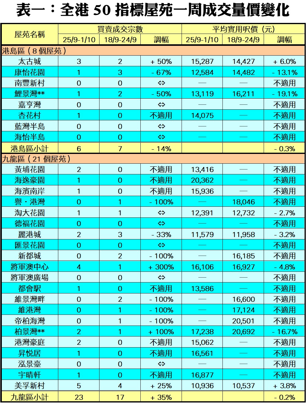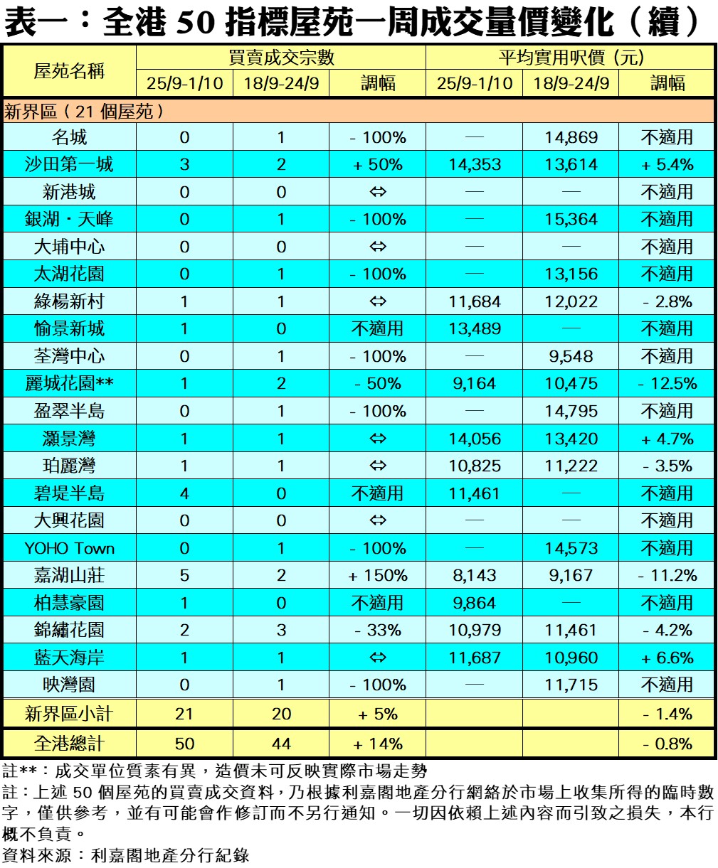 利嘉閣地產研究部主管陳海潮表示,市場屏息以待施政報告會否有放寬樓市辣招政策出台,買賣雙方大多抱持觀望態度,只有少數買家於剛過去的中秋國慶假期期間「偷步入市」,而期內未有全新一手大盤登場,部分購買力流向願意減價的二手單位,令指標屋苑交投量按周輕微增加。綜合利嘉閣地產分行數據所得,全港50個指標屋苑於上周(25/9—1/10)共錄50宗買賣個案,較前周(18/9—24/9)的44宗增加14%,已是近三周最多。
