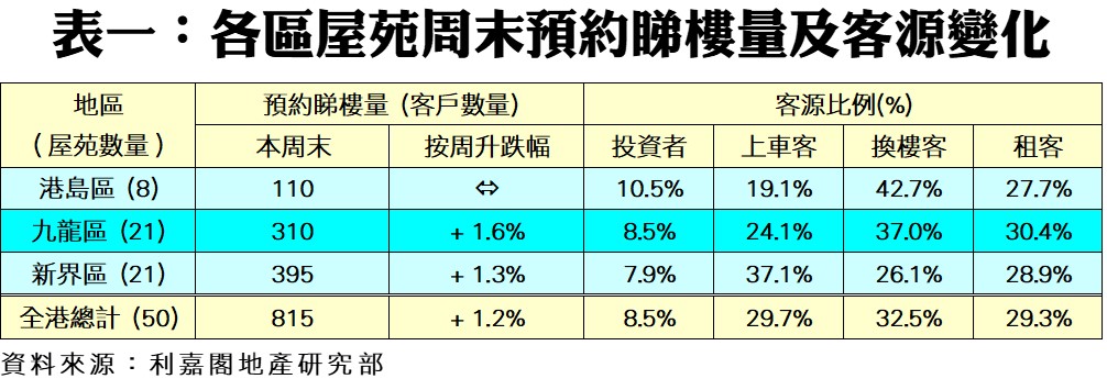 利嘉閣地產研究部主管陳海潮表示,自本地銀行調升新造按息以來,二手屋苑交投節奏持續放援,部分準買家選擇等候施政報告出台,擔心錯過樓市相關優惠政策,遲遲不願出手入市,本周末二手指標屋苑預約睇樓量續於低水平徘徊。根據利嘉閣地產研究部數據估算,全港50個指標屋苑共錄815組客戶於周末預約睇樓,按周升1.2%。