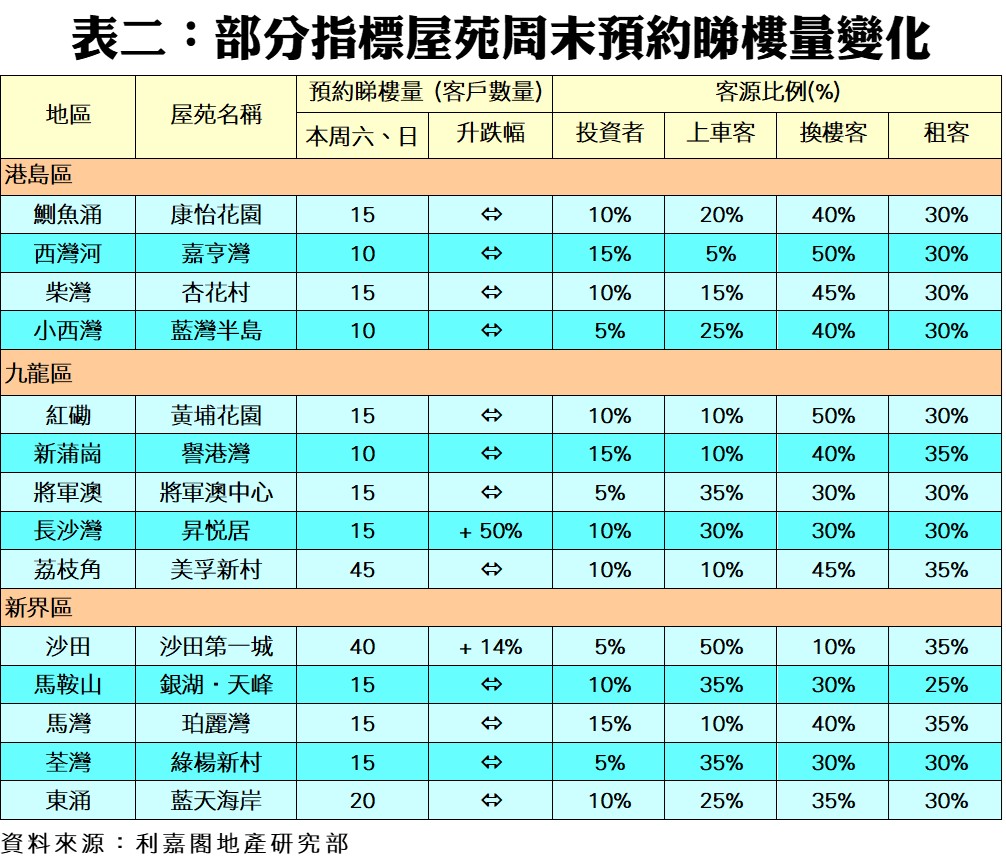 至於,港島區8個指標屋苑本周末暫錄110組客戶預約睇樓,與上周持平。利嘉閣地產逸樺園分行聯席董事吳玉蘭表示,買家態度審慎,持續觀望市場動向,甚或不願外出覓盤,暫時緩下置業部署,康怡花園睇樓量及交投量保持低企。另外,利嘉閣地產杏花村分行聯席董事黃銳平指出,現時樓市交投氣氛低迷,市民缺乏入市動力,等候月內施政報告對樓市的相關減辣措施出台後再作打算,整體二手市況偏靜,杏花村本周末預約睇樓人數續於低位水平徘徊。