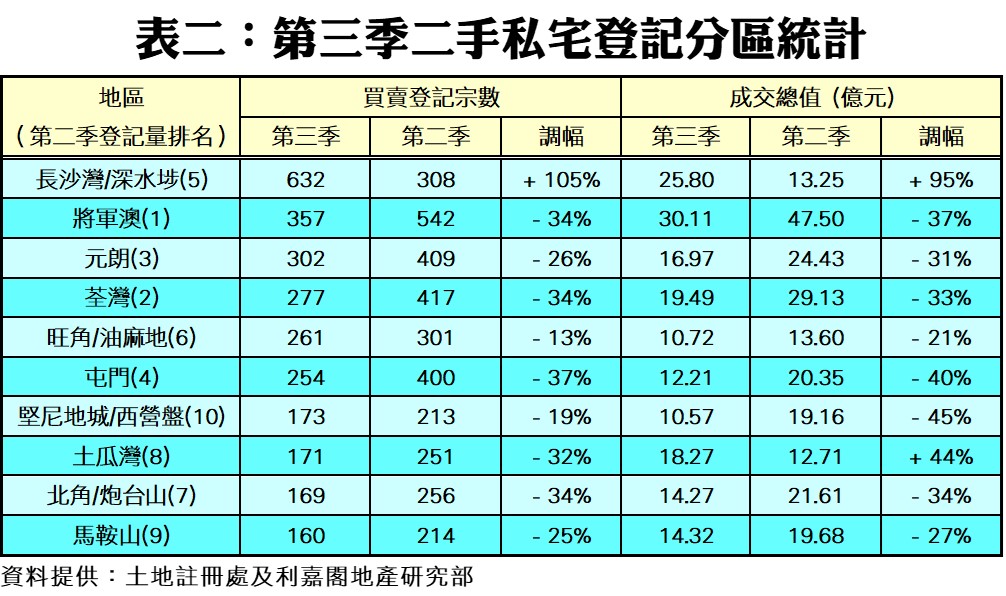 按地區分析,從買賣最活躍的十個地區觀察,今年第三季錄得九跌一升,跌幅介乎13%至37%不等;當中以屯門區二手私宅登記量跌幅最大,季內僅錄得254宗登記,按季大減37%;而將軍澳、北角/炮台山及荃灣區登記量亦齊齊錄得約34%的跌幅,各錄357宗、169宗及277宗。至於登記量最活躍者由長沙灣/深水埗取代了傳統的將軍澳區,季內勁錄632宗登記,按季逆市大增1.05倍,主因是季內錄得合共318宗屬於市建局收購長沙灣兼善里/福華街發展項目的登記個案。