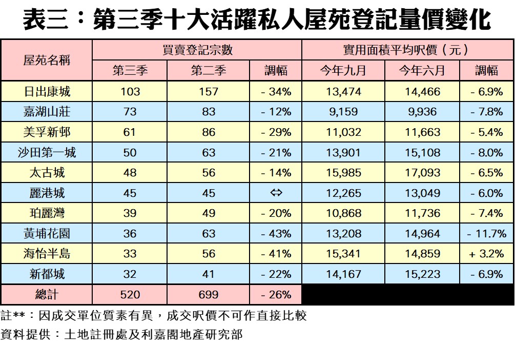 十大活躍屋苑Q3買賣520宗 季挫26%