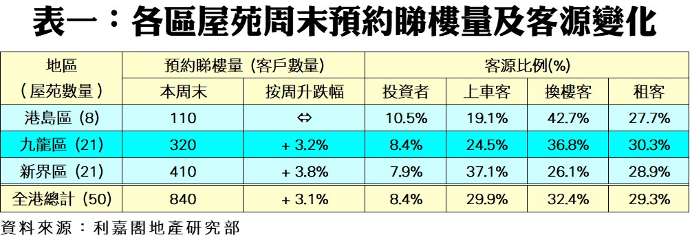 九龍區21個指標屋苑於周末暫錄320組客戶預約睇樓,按周升3.2%。利嘉閣地產匯景分行首席聯席董事萬達人指出,二手交投氣氛淡靜,業主態度亦有軟化跡象,開價亦有適度減幅;然而買家受制於高息困擾,加上現正等候月內施政報告出台,期盼有撤辣措施協助上車,遲遲不願出擊,二手屋苑買賣呈現呆滯。不過,上周日受颱風吹襲影響導致市面人流大幅減少,而本周末天氣回穩,藍田區預約睇樓人數因而回升。