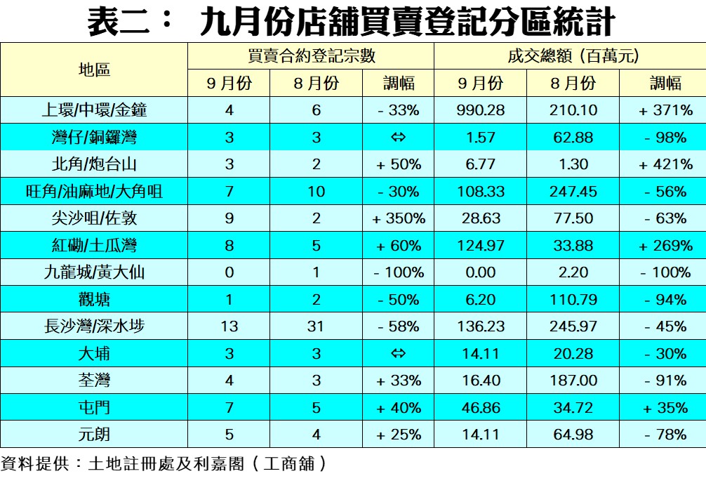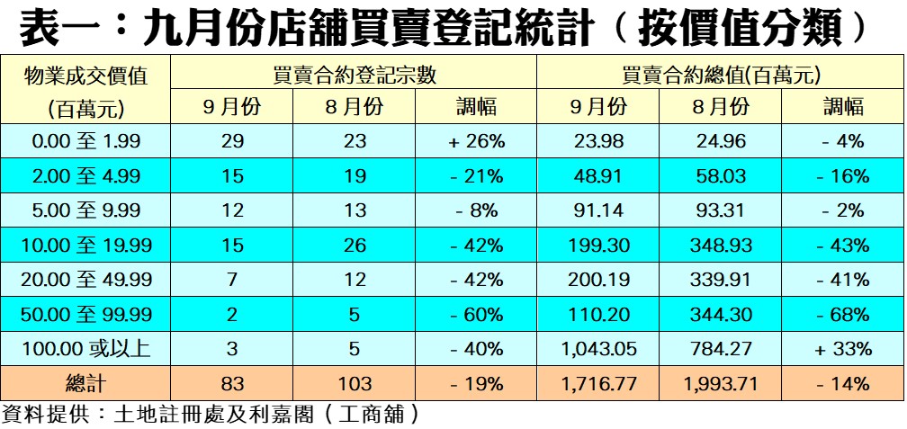 按物業價格劃分,在7個價格組別當中,共有6個組別的登記量報跌,跌幅介乎8%至60%不等。當中以5,000萬至1億元以內組別的登記量跌幅最大,由八月的5宗大減至九月的2宗,跌幅達60%。至於1,000萬至2,000萬元以內及2,000萬至5,000萬元以內兩個組別,亦同告減少42%,至分別錄15宗及2宗登記。值得注意的是,200萬元以下的細價店舖逆市造好,九月份錄得29宗登記,除按月升26%外,亦成為買賣登記最旺的銀碼層;至於1億元或以上的貴價店舖登記則按月減少40%,只錄得3宗,反映高價店舖買賣仍較緩慢(見表一)。