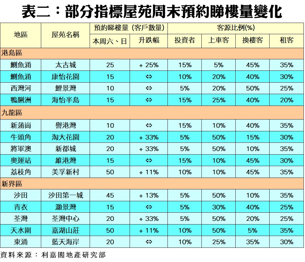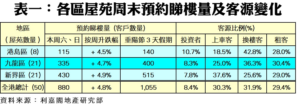 利嘉閣地產研究部主管陳海潮表示,近月本港樓市交投淡靜,市場對樓市減辣、撤辣呼聲言猶在耳,不少準買家趁施政報告出台前的長假期外出尋寶,務求在相關政策正式落實前搶佔先機,本周末二手指標屋苑預約睇樓量升勢持續。根據利嘉閣地產研究部數據估算,全港50個指標屋苑共錄880組客戶於周末預約睇樓,按周升4.8%,創近12周新高,而重陽節3天假期則約有1,055組客戶。