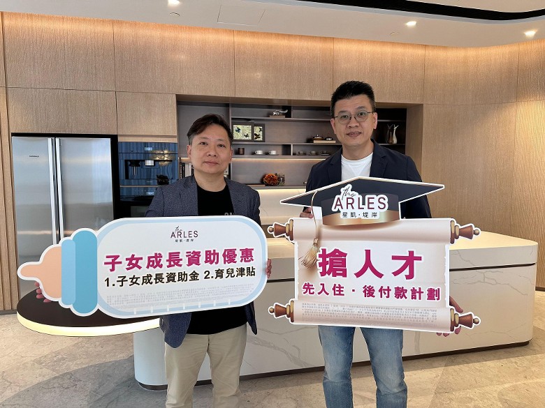 中洲置業營銷策劃總監楊聰永(左)指出,如買家於簽署臨時買賣合約起一年內,有家庭成員有未滿18歲人士或新增初生成員,即可獲「子女成長資助金優惠」,一房或以下可享4.8萬元額外折扣優惠,兩房可享8.8萬元,三房或以上則可享13.8萬元。另一項優惠為「育兒津貼優惠」,如買家於簽署臨時買賣合約起一年內,家庭成員有未滿3歲人士或新增初生成員,可享1萬元額外折扣優惠。