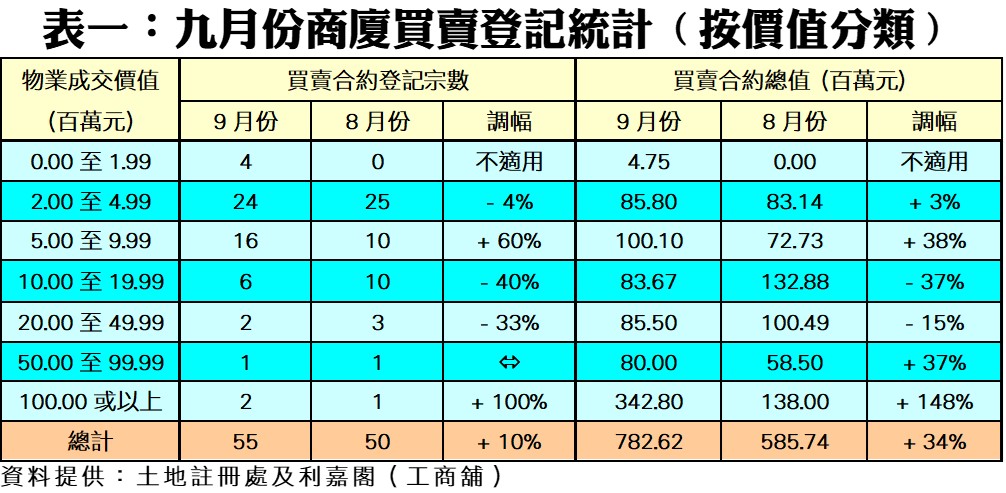 按物業價格劃分,在7個價格組別的登記量當中,錄得三升三跌及一持平。在上升的銀碼層中,以200萬元以下者再凌厲,由八月的「零成交」大增至九月的4宗;其次1億元或以上者,亦倍增至2宗;而登記量次多500萬至1,000萬元以內的中細價商廈,亦按月大增60%,共錄得16宗登記,反映普遍中高低價商廈交投均呈回暖。