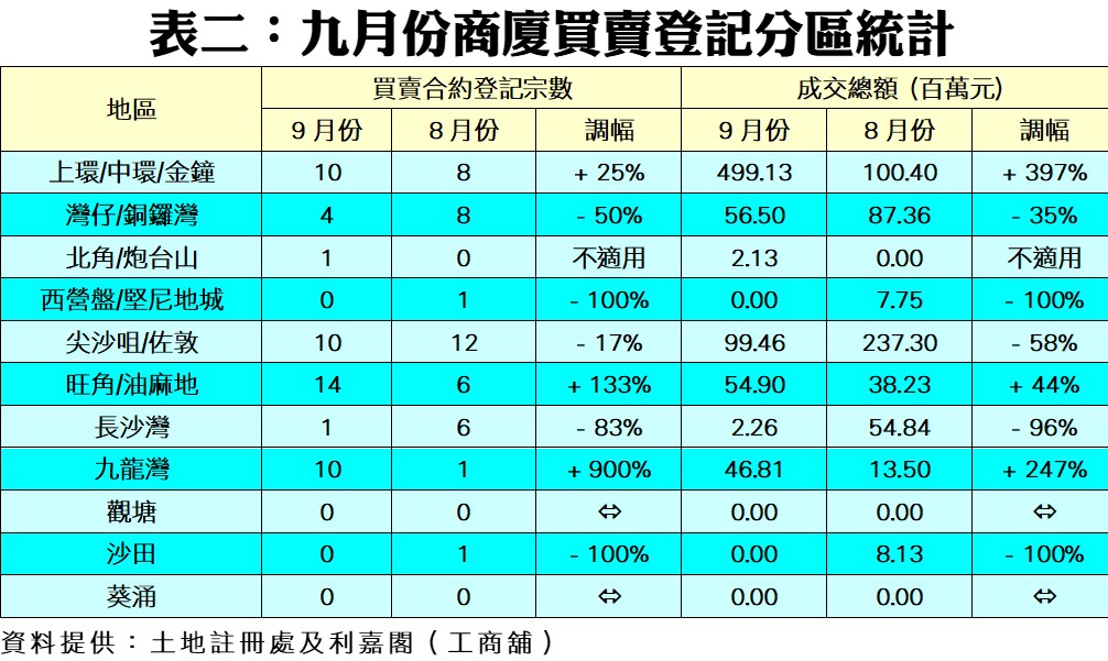 以地區劃分,在本行觀察的11個分區當中,共有4區的登記量按月上升,5區下跌及2區持平;當中北角/炮台山區突破「零登記」,於九月份錄得1宗。至於九龍灣區升勢強勁,急漲9倍,由前月的1宗,激增至九月份共10宗登記;至於旺角/油麻地區亦大增1.33倍至14宗,並取代尖沙咀/佐敦區成為九月份登記量最旺的觀察區。此外,傳統的核心商業區上環/中環/金鐘區的登記量亦升25%,月內共錄10宗登記。