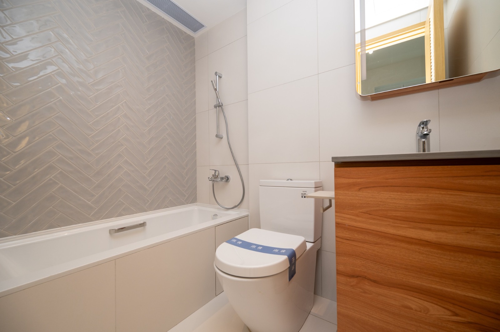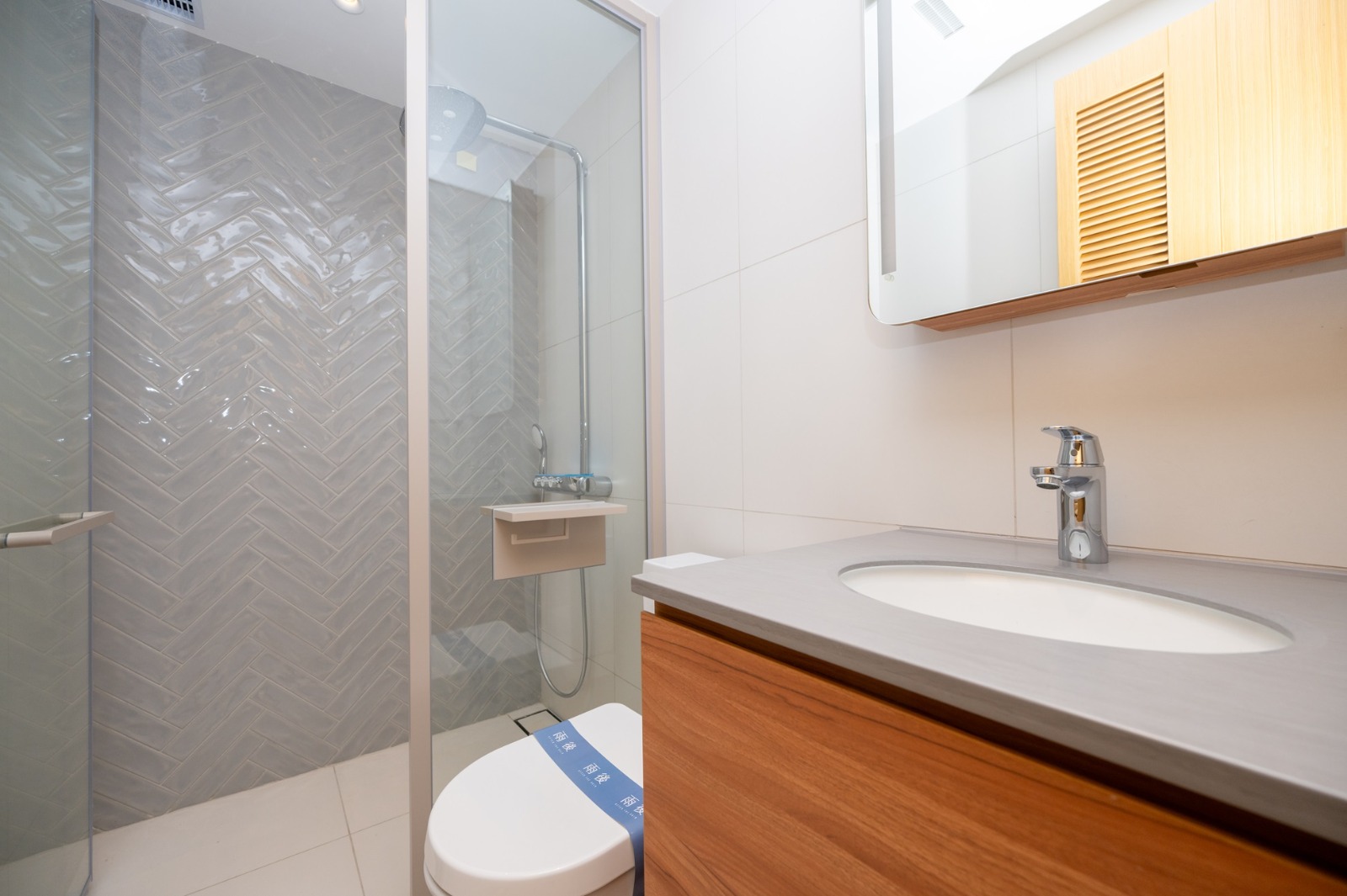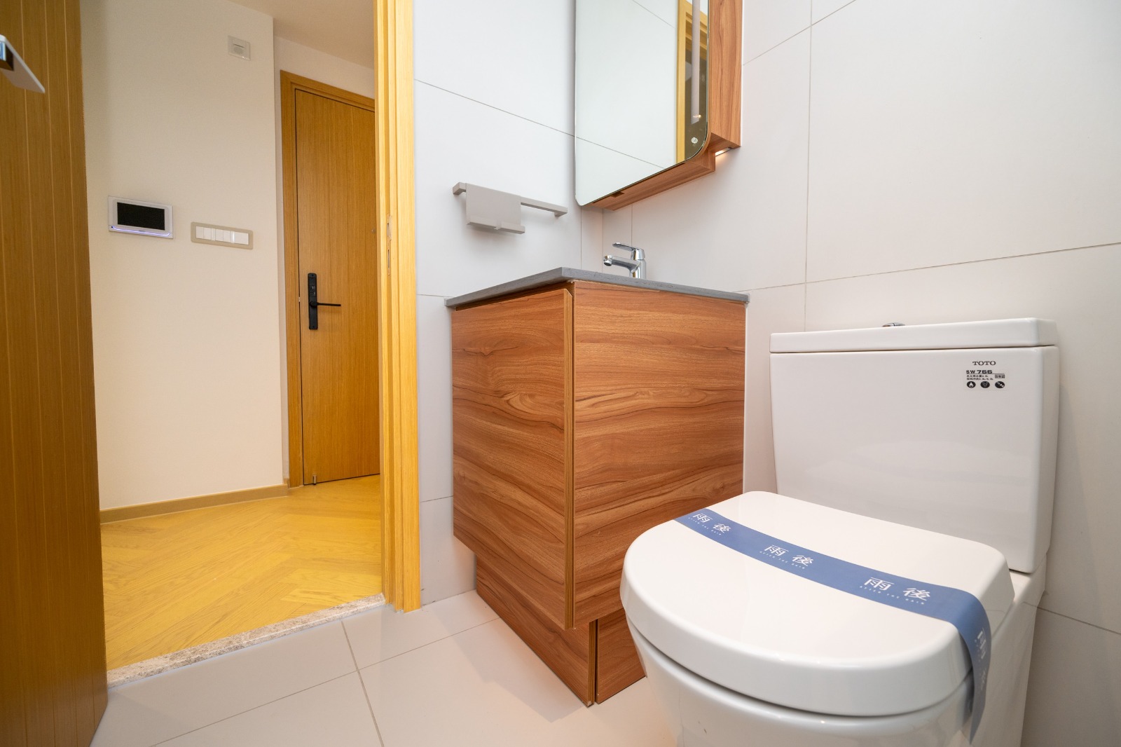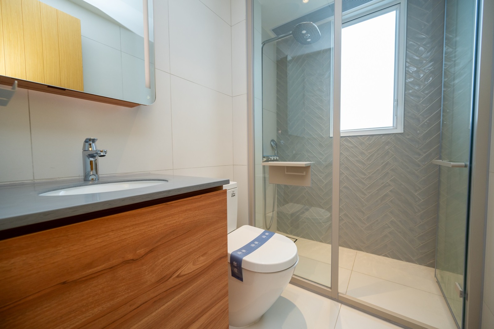 睡房1放置雙人床後仍感闊落,房間內設有玻璃窗戶,大大提升房內的空間感;睡房2同樣間隔方正,住客可靈活添置不同傢俬。浴室置物空間充裕,設有洗手盆櫃、鏡櫃及置物櫃,供住戶放置洗滌用品。
