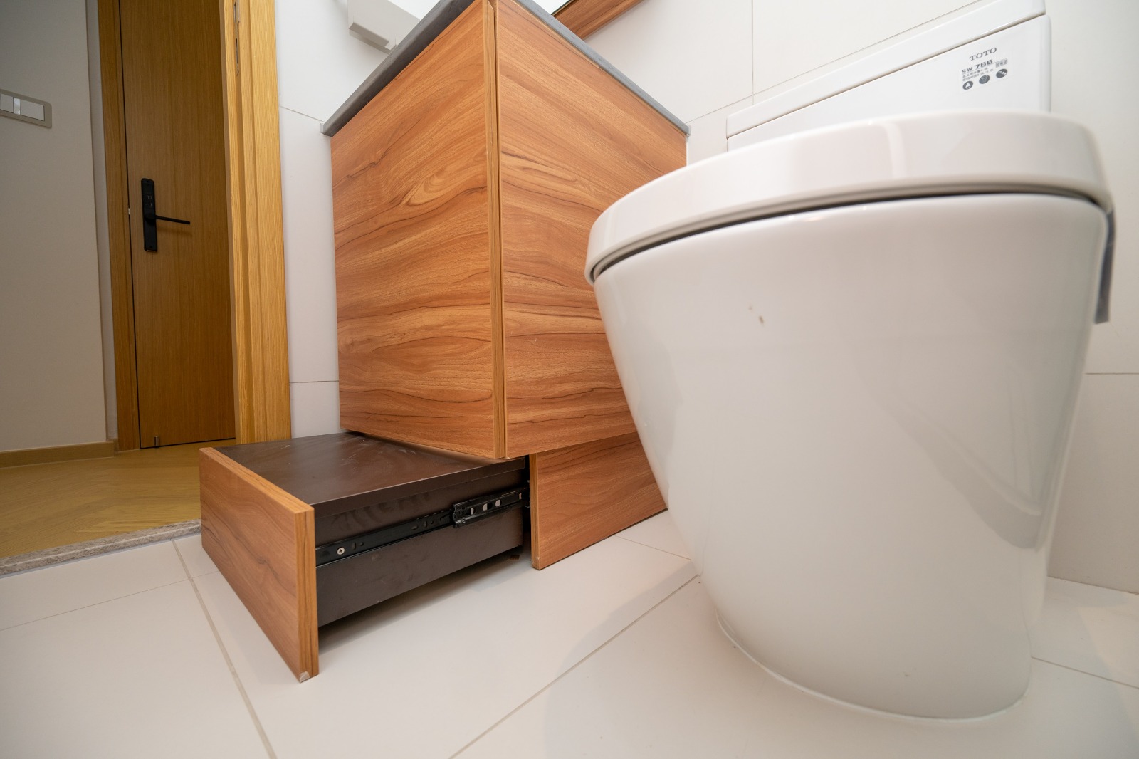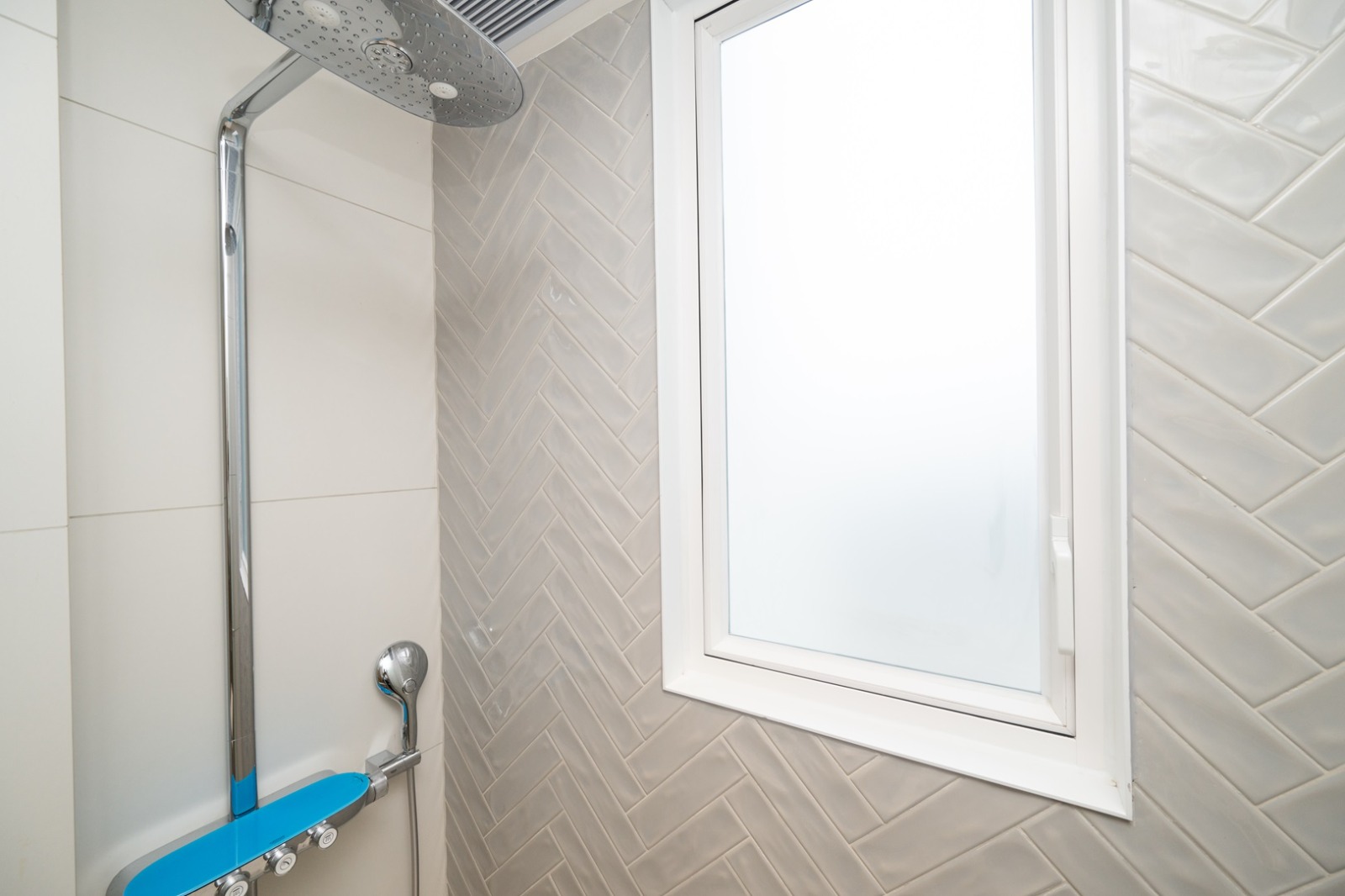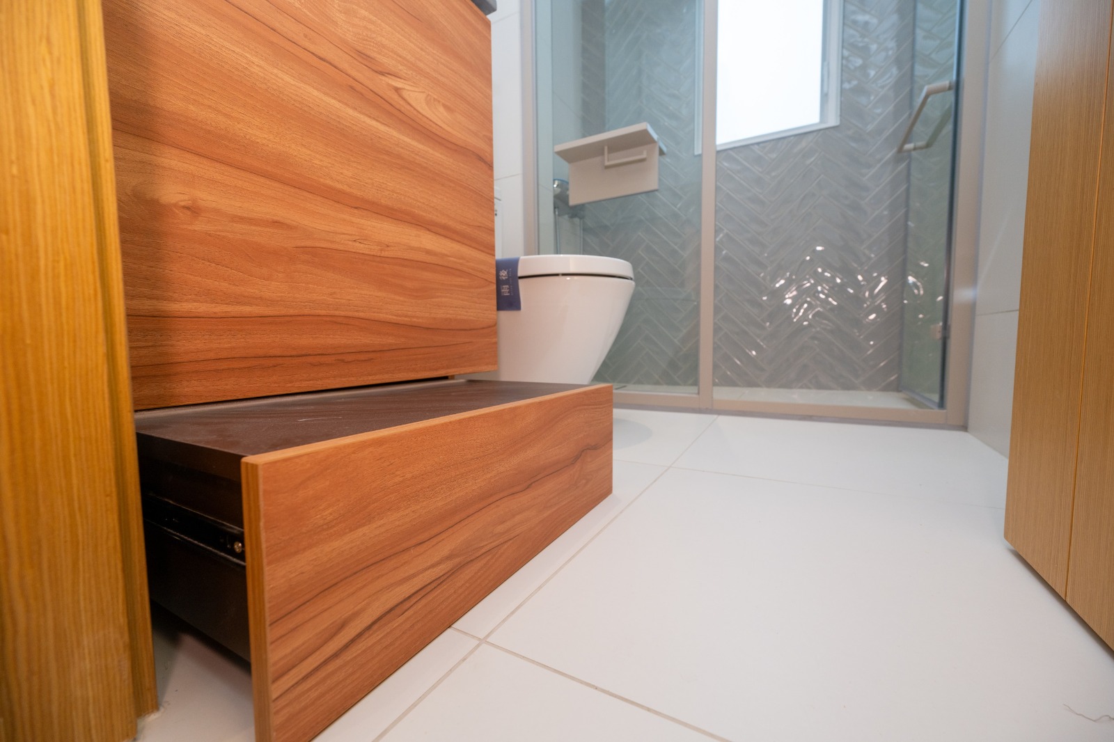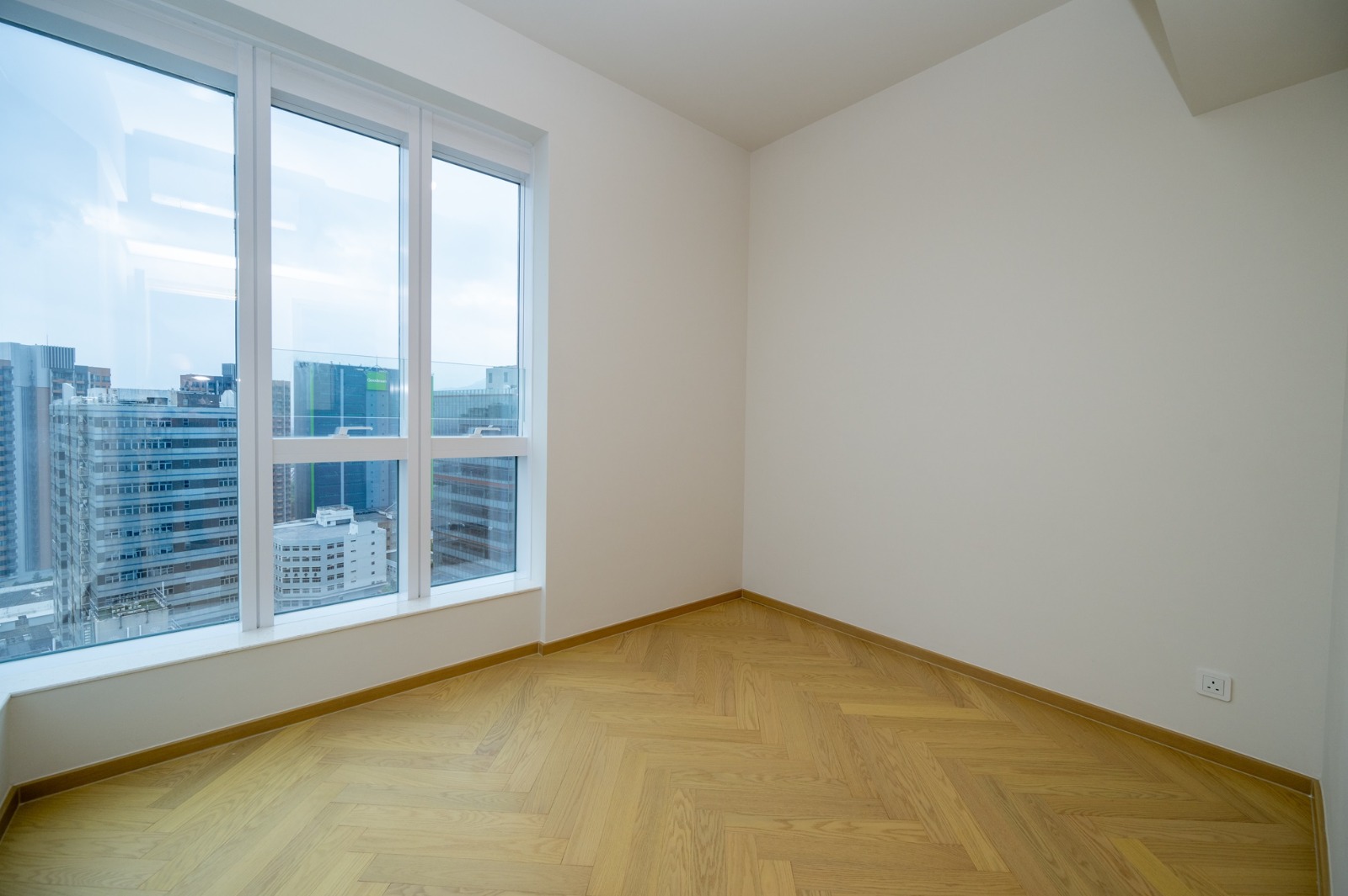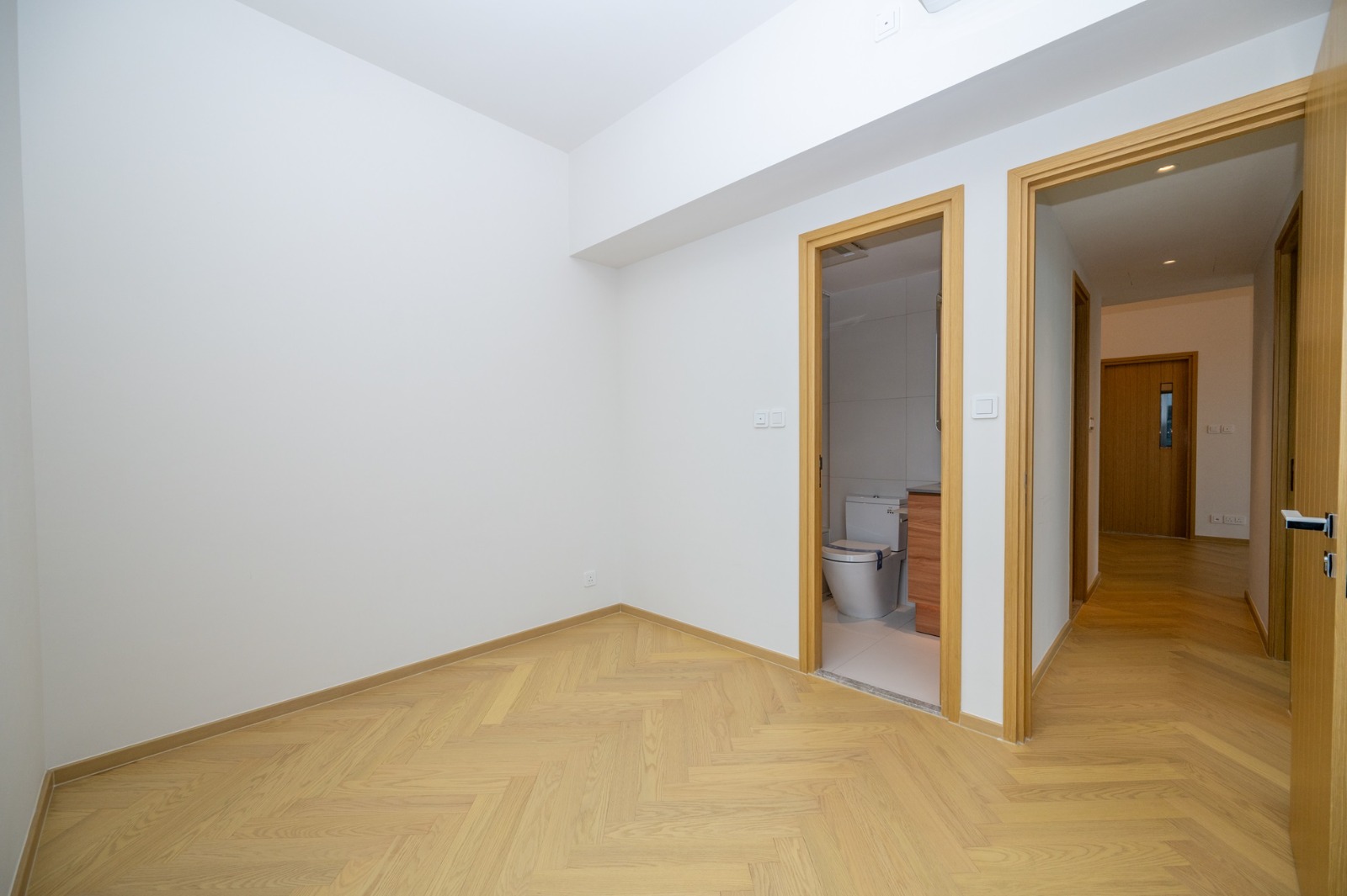 睡房1放置雙人床後仍感闊落,房間內設有玻璃窗戶,大大提升房內的空間感;睡房2同樣間隔方正,住客可靈活添置不同傢俬。浴室置物空間充裕,設有洗手盆櫃、鏡櫃及置物櫃,供住戶放置洗滌用品。