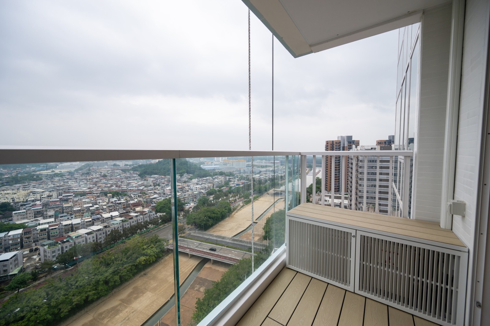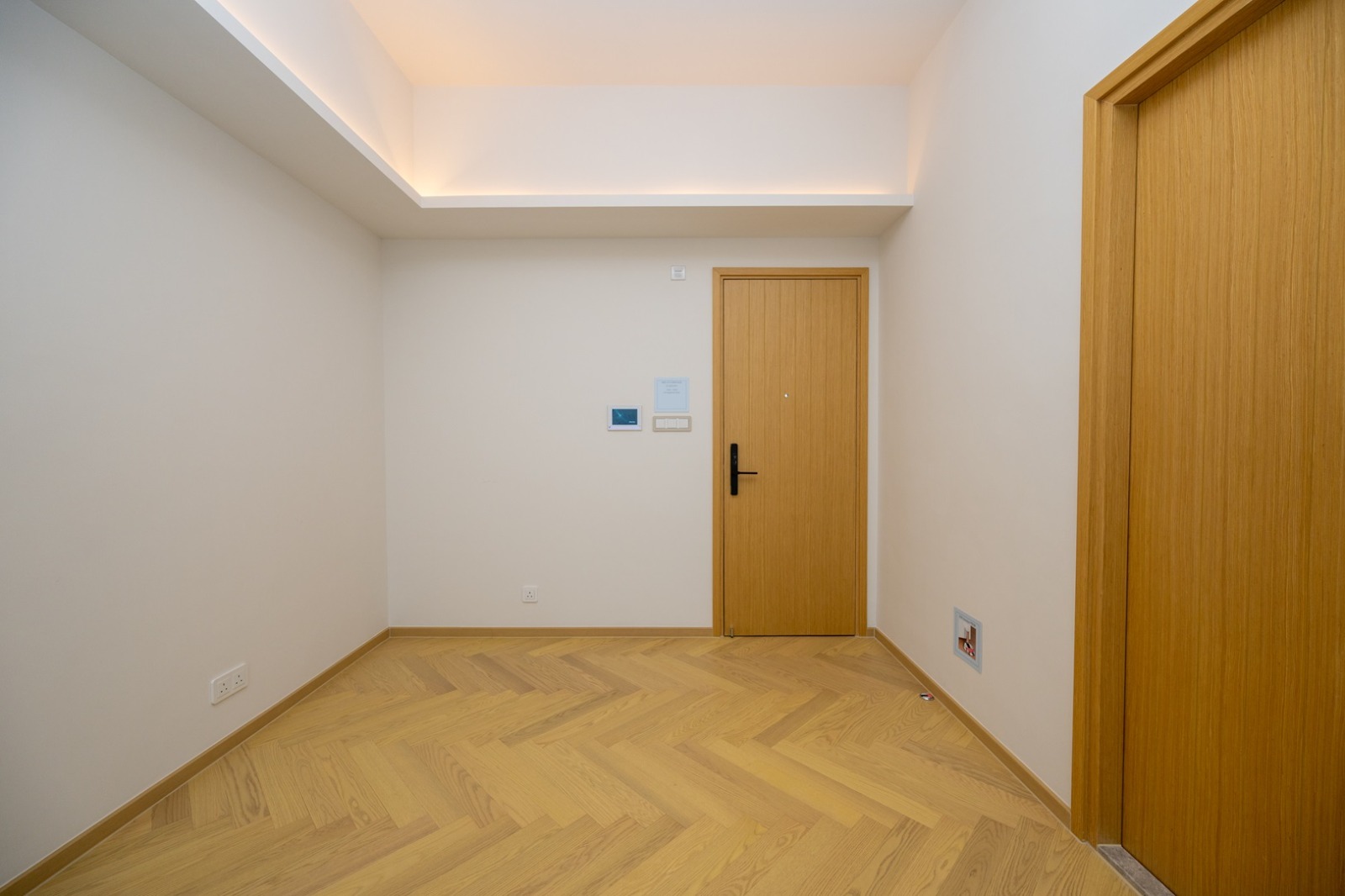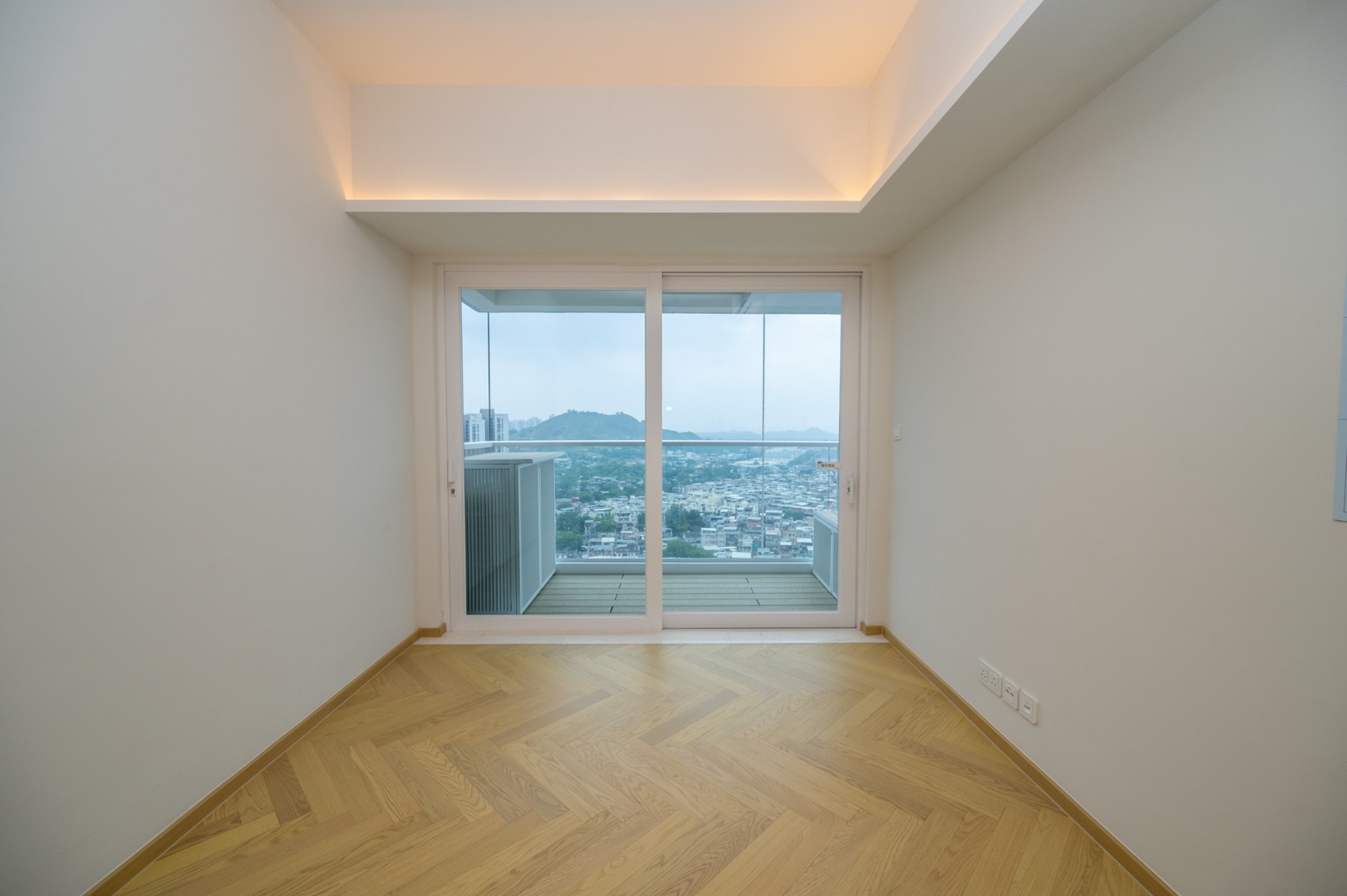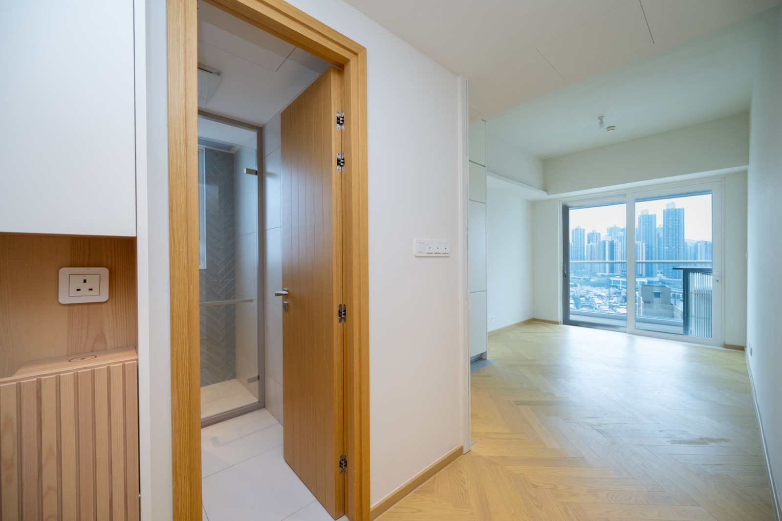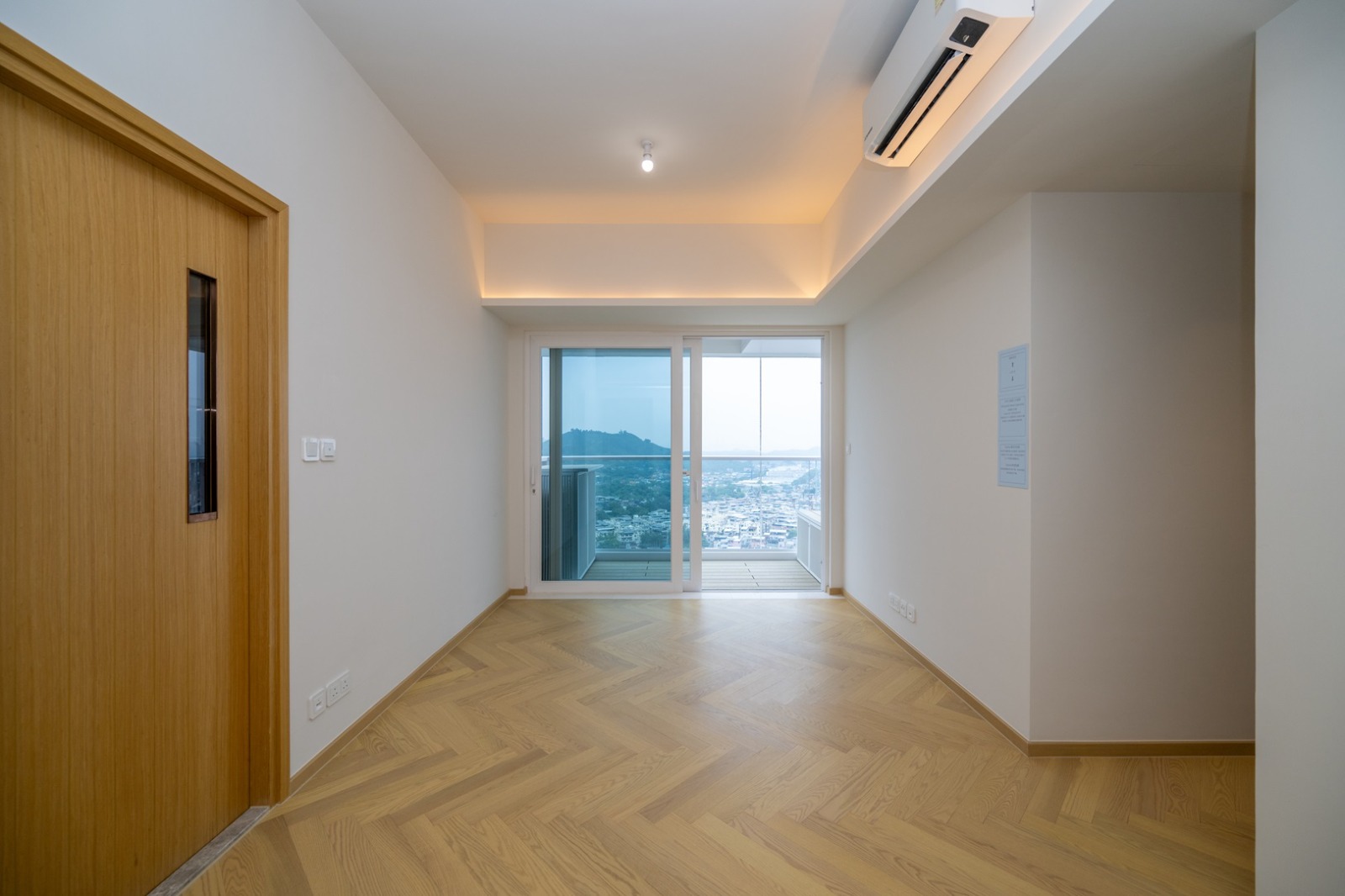 單位大門採用LOCKLY纖幼智慧電子門鎖,多種開鎖方式,為住戶提供高私隱度且便捷的生活享受。單位內的地板亦貼心鋪砌減衝擊噪音墊層,大大降低衝擊所產生的噪音,住戶盡享寧謐安逸的居住環境。單位客飯廳空間寬敞實用,長方形設計讓住戶可隨意放置各種大型傢俬,更以玻璃趟門設計連接室外空間,為屋內提供大量自然光線,延伸室內空間,令客飯廳更顯寬敞明亮。
