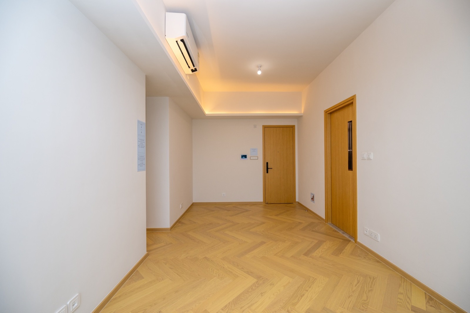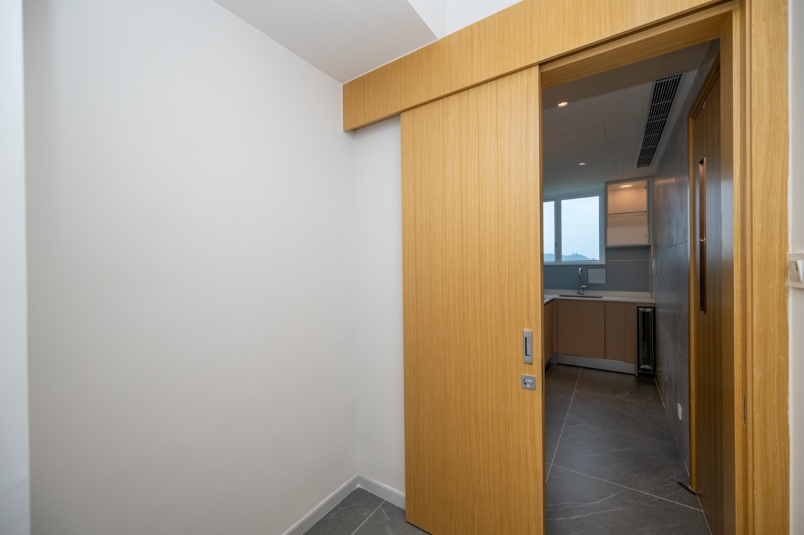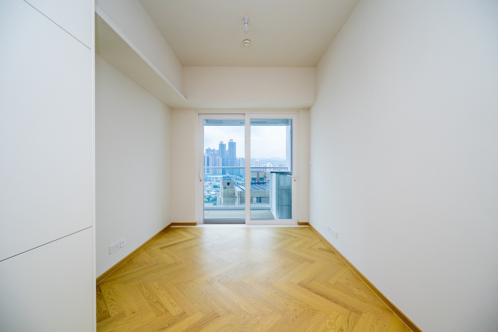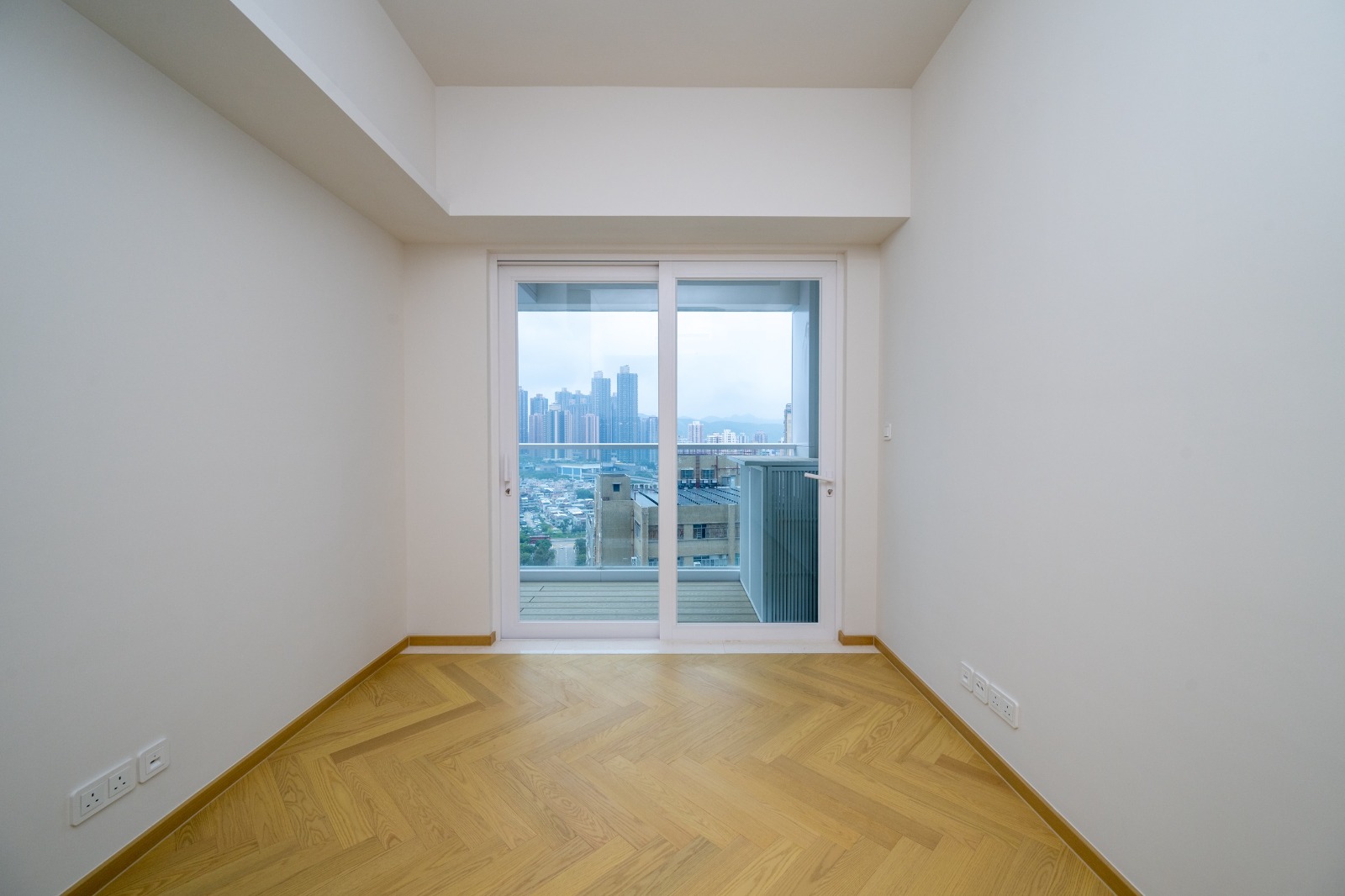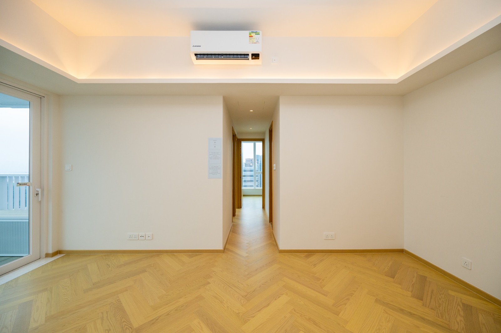 單位大門採用LOCKLY纖幼智慧電子門鎖,多種開鎖方式,為住戶提供高私隱度且便捷的生活享受。單位內的地板亦貼心鋪砌減衝擊噪音墊層,大大降低衝擊所產生的噪音,住戶盡享寧謐安逸的居住環境。單位客飯廳空間寬敞實用,長方形設計讓住戶可隨意放置各種大型傢俬,更以玻璃趟門設計連接室外空間,為屋內提供大量自然光線,延伸室內空間,令客飯廳更顯寬敞明亮。