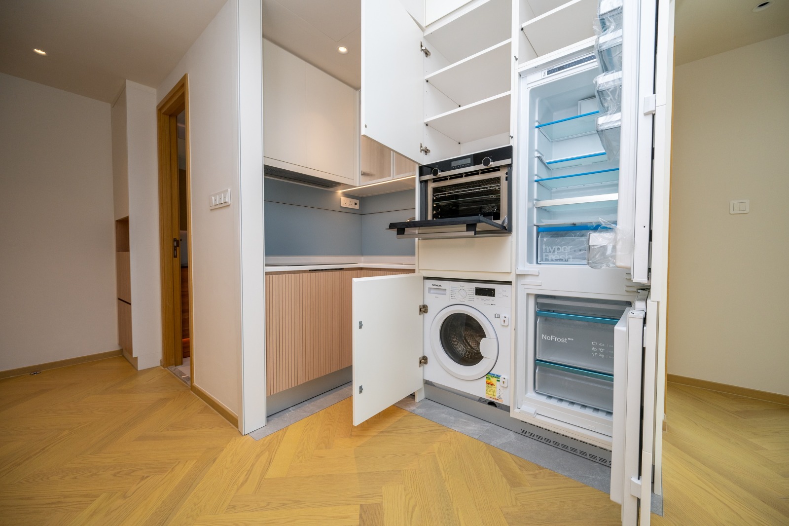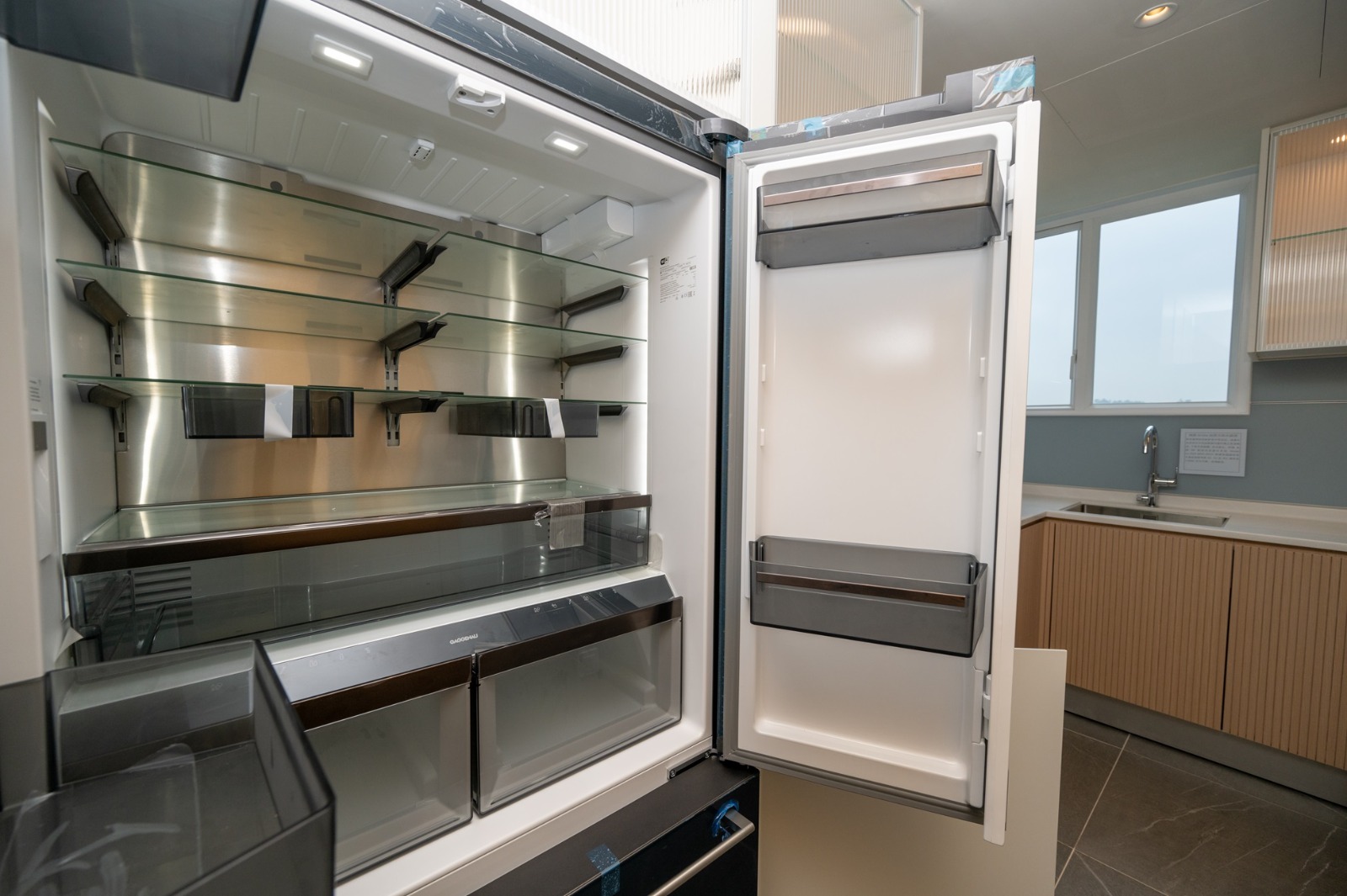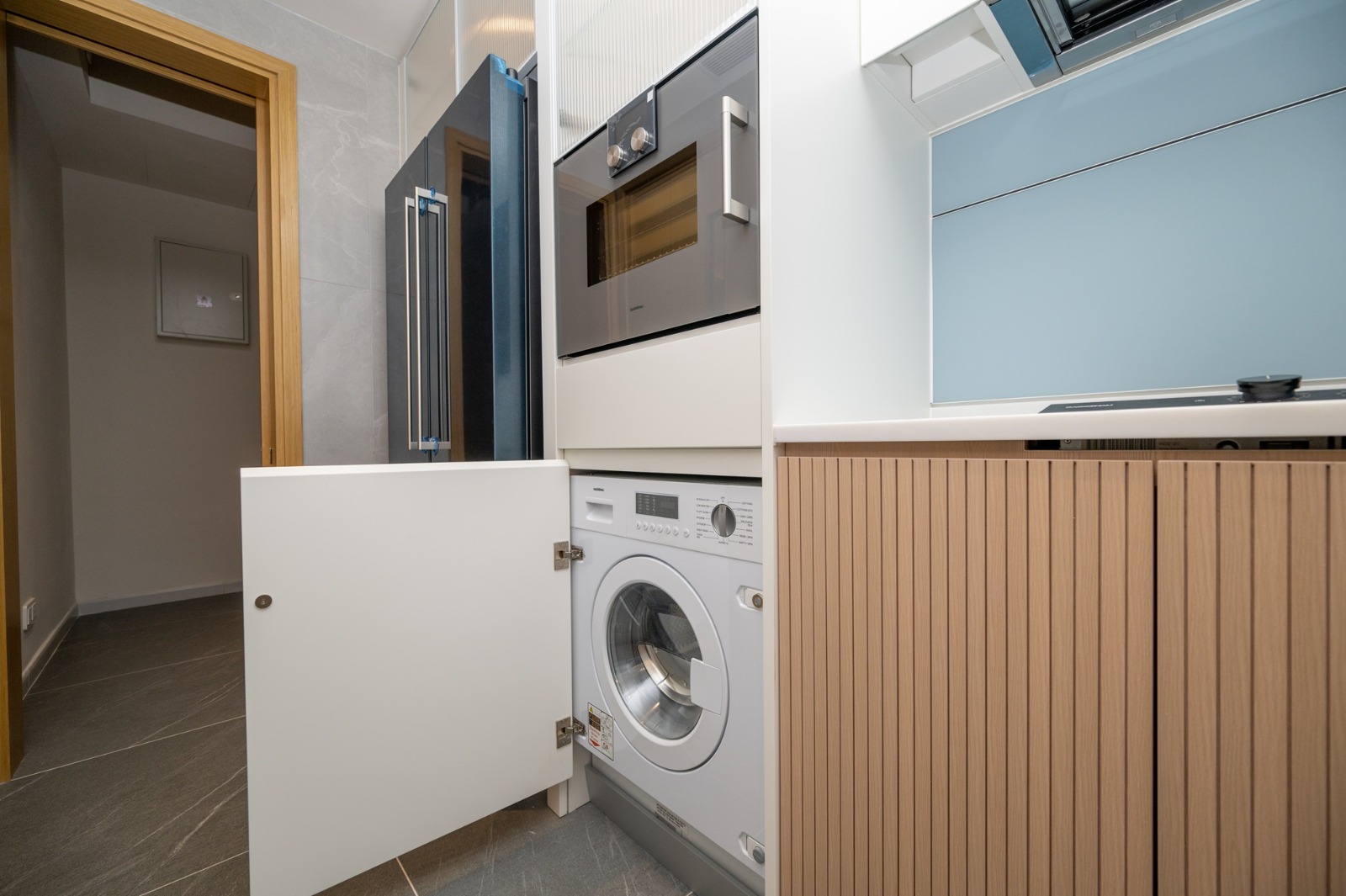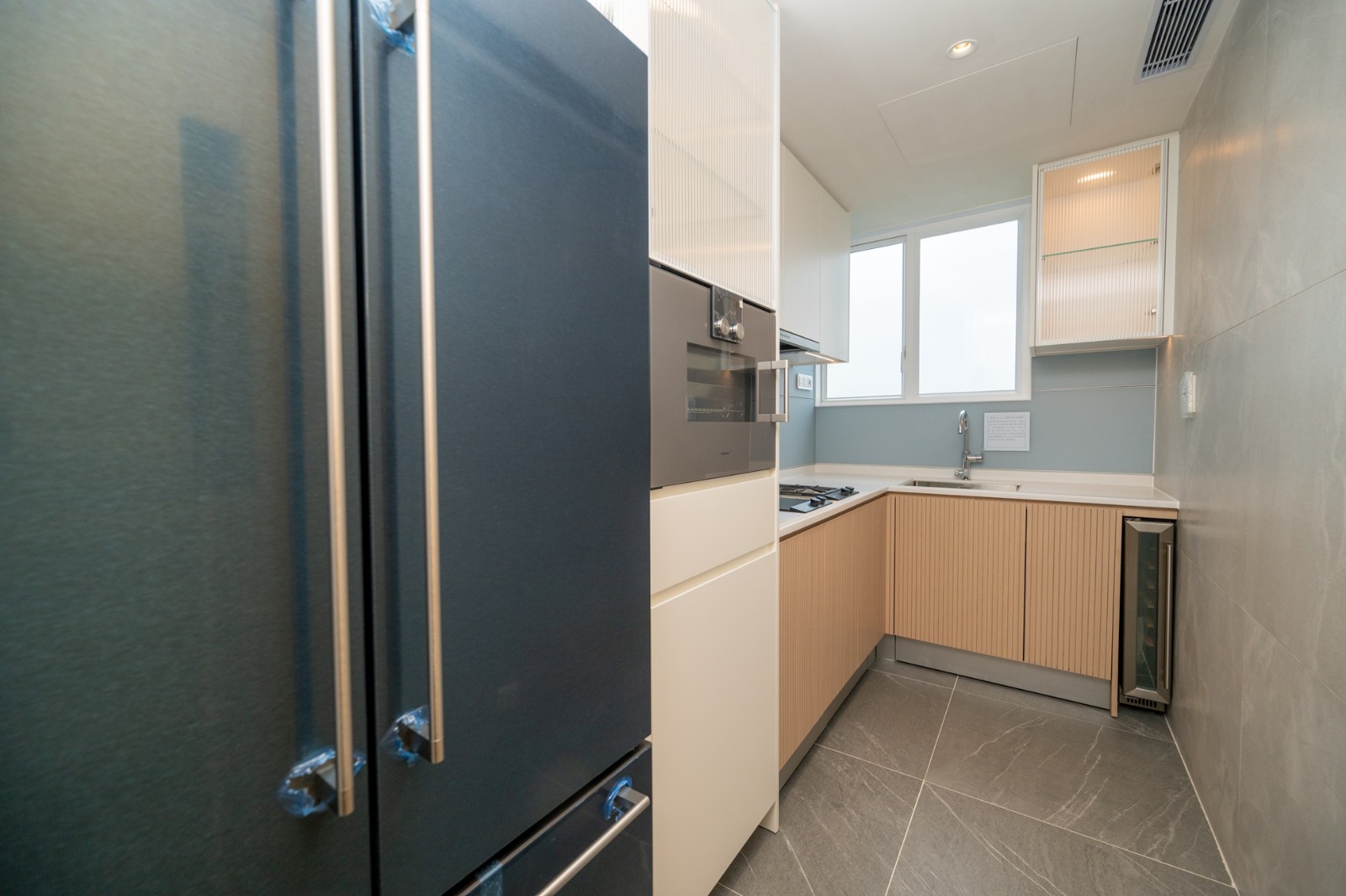 單位採用長形獨立廚房設計,設置L形工作檯面,方便住戶作日常煮食備料之用。廚房配備Gaggenau蒸焗爐、雪櫃、電磁爐、雙爐頭煤氣煮食爐、洗衣乾衣機及抽油煙機,更附設Vinvautz酒櫃,方便住戶貯藏心中所愛,獨享尊貴的品味生活空間。廚房旁的儲物房間隔工整實用,提供充裕的儲物空間。