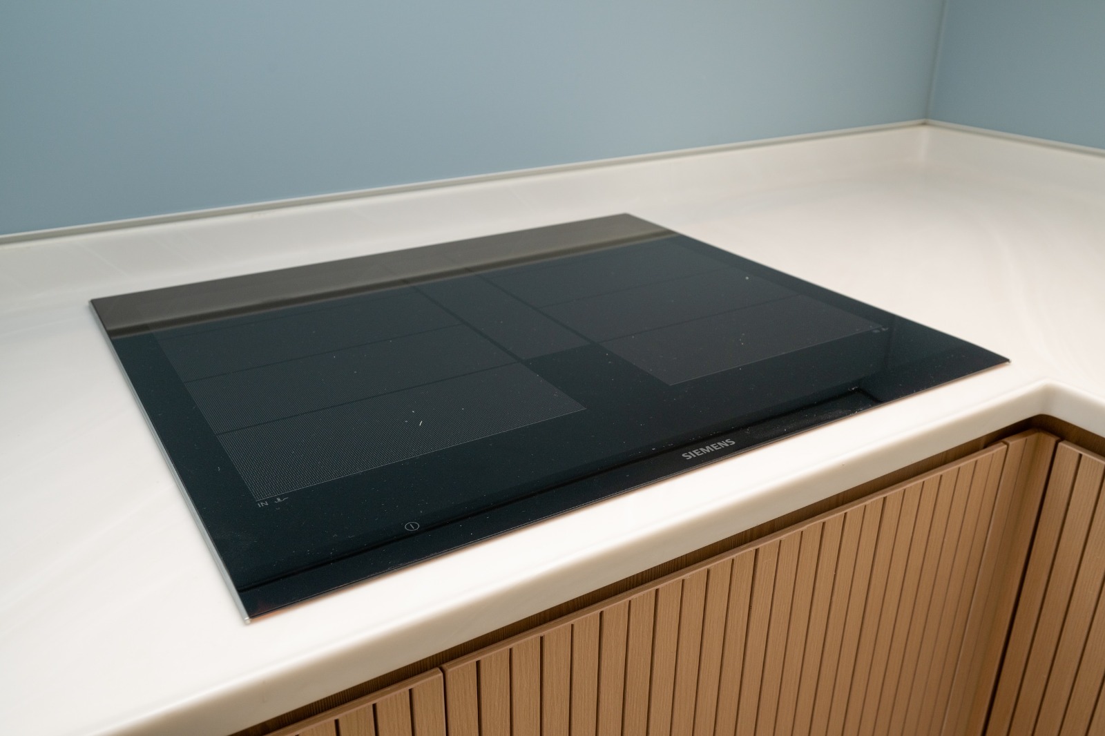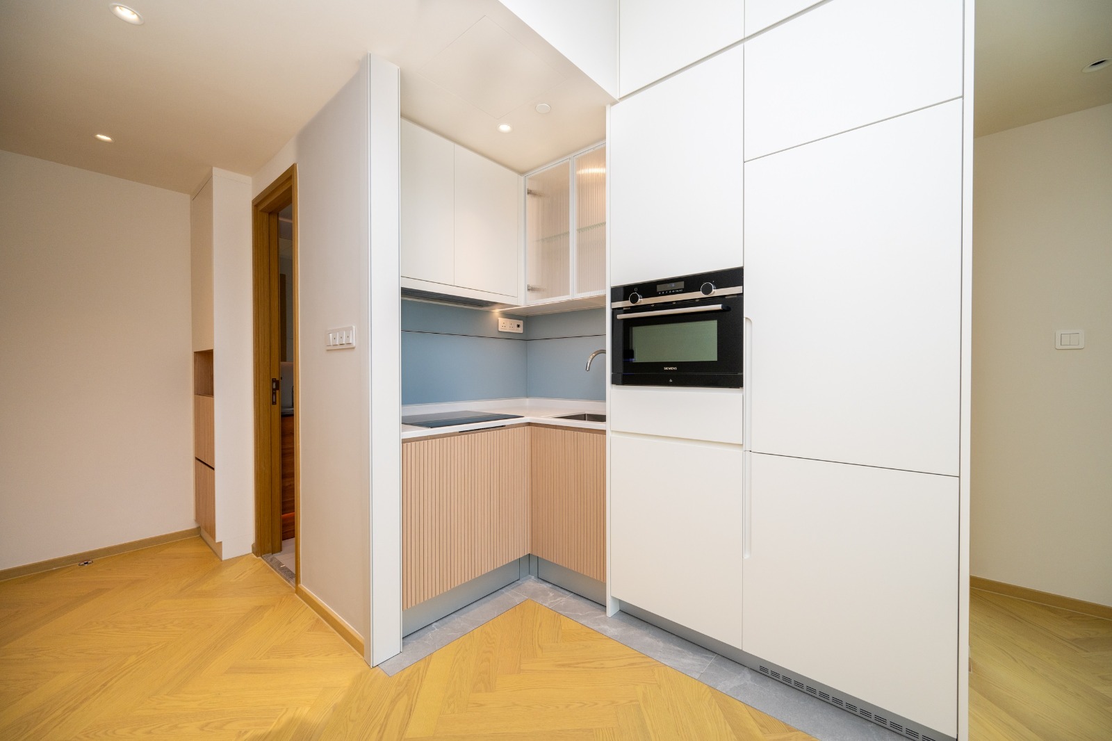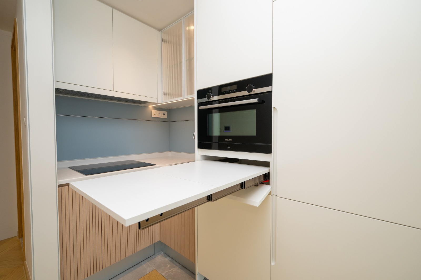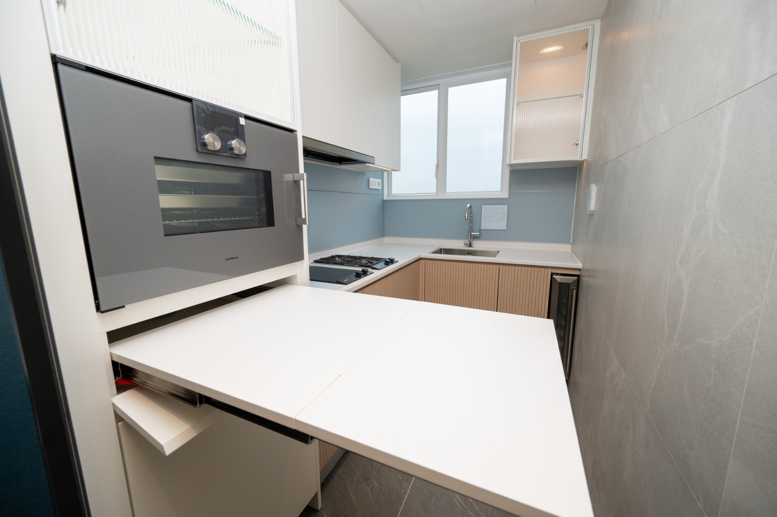 單位間隔靈活實用,長方形的客飯廳空間感十足,以玻璃趟門設計連接露台及工作平台,為室內引入自然光線,室內更見通爽。廚房採開放式設計,廚櫃內設收納式摺疊餐桌,用餐時,住戶拉出餐桌,放置椅子後,即可變成用餐區,方便實用,更設德國品牌Siemens電磁爐、七合一微蒸烤焗爐、雪櫃、洗衣乾衣機及抽油煙機。