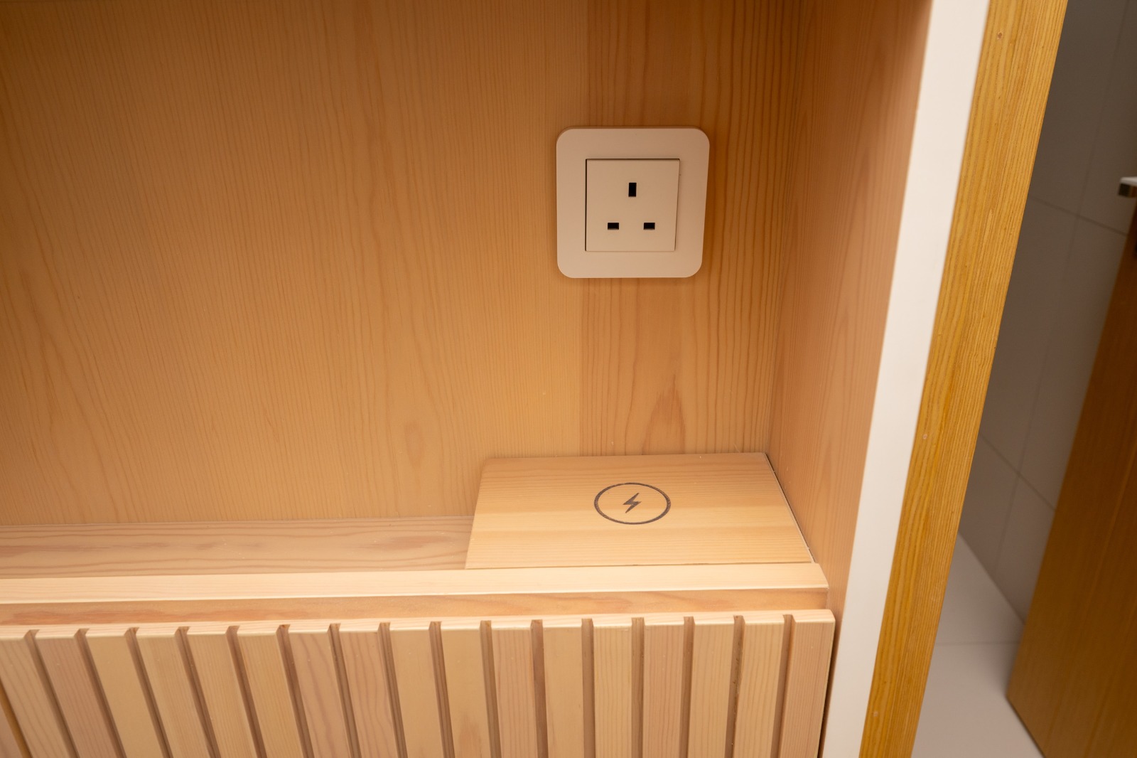 其中21樓F室,兩房間隔,實用面積475方呎,連22方呎的露台與16方呎的工作平台,合拼成特大的戶外活動空間,住戶可飽覽開揚河景及璀璨城景。單位大門側設有一組高身的儲物櫃,方便住戶計劃日常生活,儲物櫃內附多格層板,提供貯物空間,可擺放各種生活用品,備有三腳插座、USB 插座及無線充電器,實用時尚兼備。